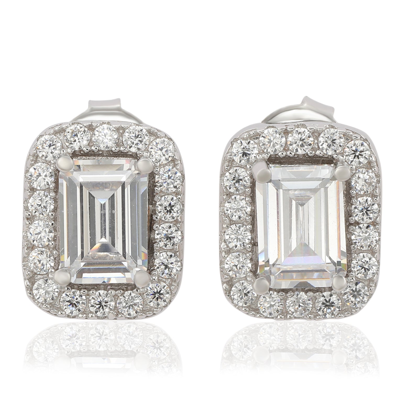 Suzy Levian Sterling Silver Cubic Zirconia Emerald Cut Halo Stud Earrings