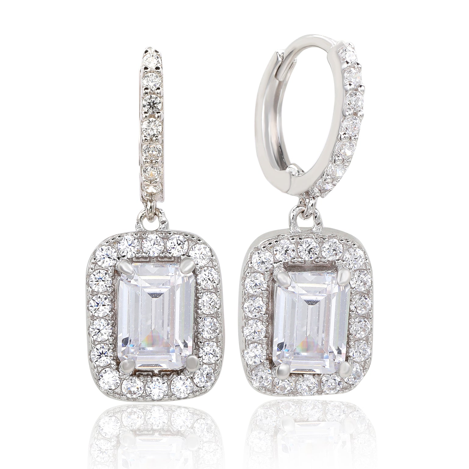 Suzy Levian Sterling Silver Cubic Zirconia Emerald Cut Halo Dangling Earrings
