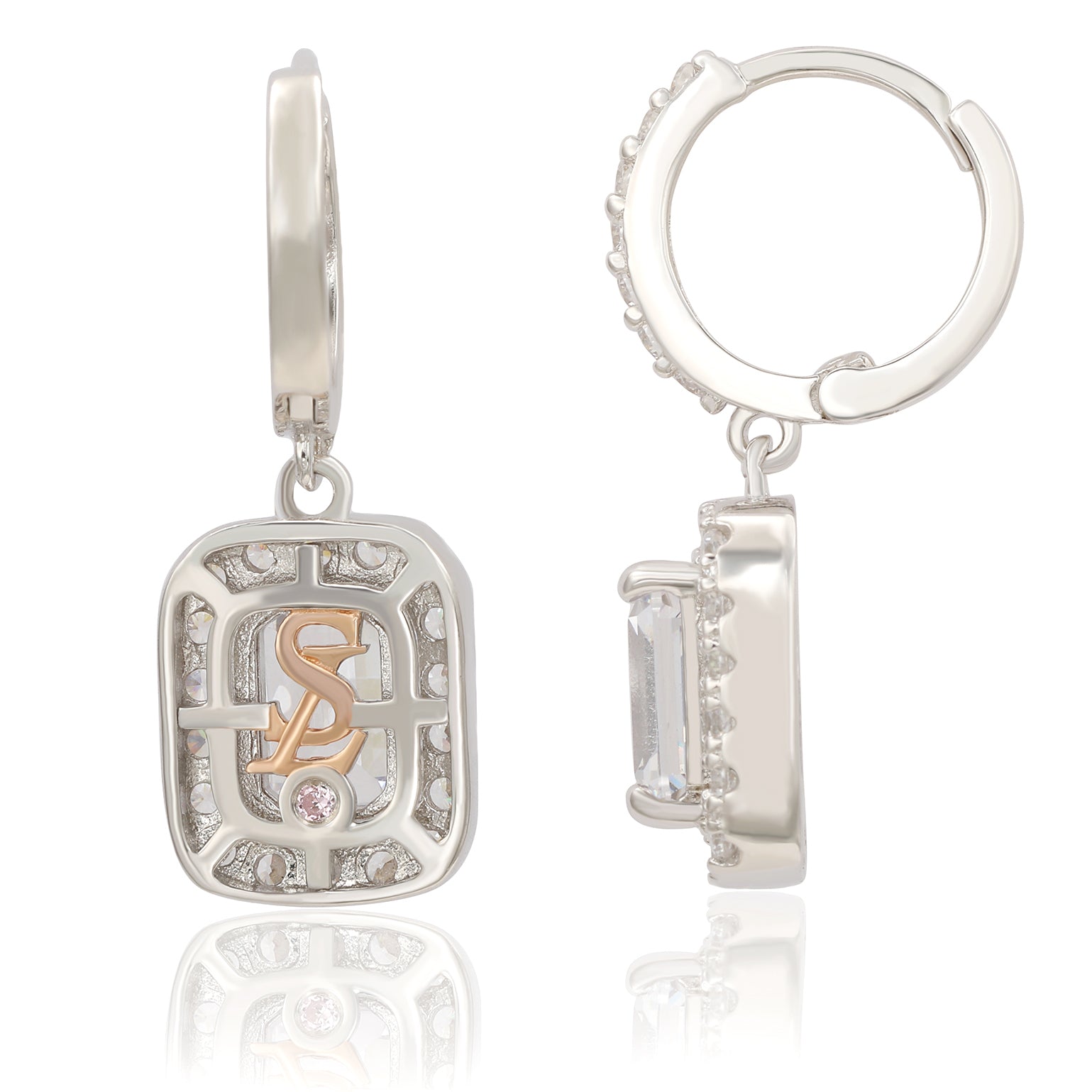 Timeless and always classy, with the right kick, these earrings are designed and crafted by Suzy Levian. An Emerald-cut white cubic-zirconia center stone is surrounded by a halo of round white pave set cubic-zirconia giving the dangling earring that extra sparkle. These earrings are secured with a leverback closure for a snug-tight fit. These earrings are designed by Suzy Levian with a message. By creating jewelry that is beautiful inside and out, Suzy Levian's message is revealed through a hidden stone set inside the shank of the earrings to empower women to discover their inner strength, power and beauty. 'Together we can inspire the world to appreciate the diamond in ourselves.' - Suzy Levian