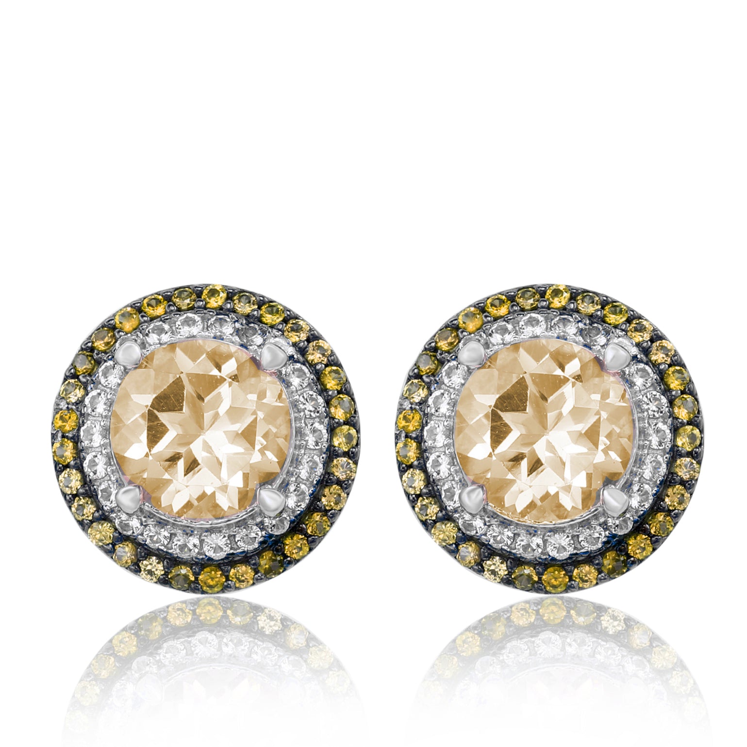 Treat yourself to these gorgeous orange citrine studs, perfect for an extra sparkle to your ensemble at all time. So much beauty, sparkle and design is packed into these studs featuring 2 large round-cut orange citrine surrounded by a double halo of cushion shaped round-cut yellow sapphires and white topaz. These studs are finished with a closed back gallery with an 18k yellow gold plated logo, highlighting Suzy Levian's SL signature stamp.