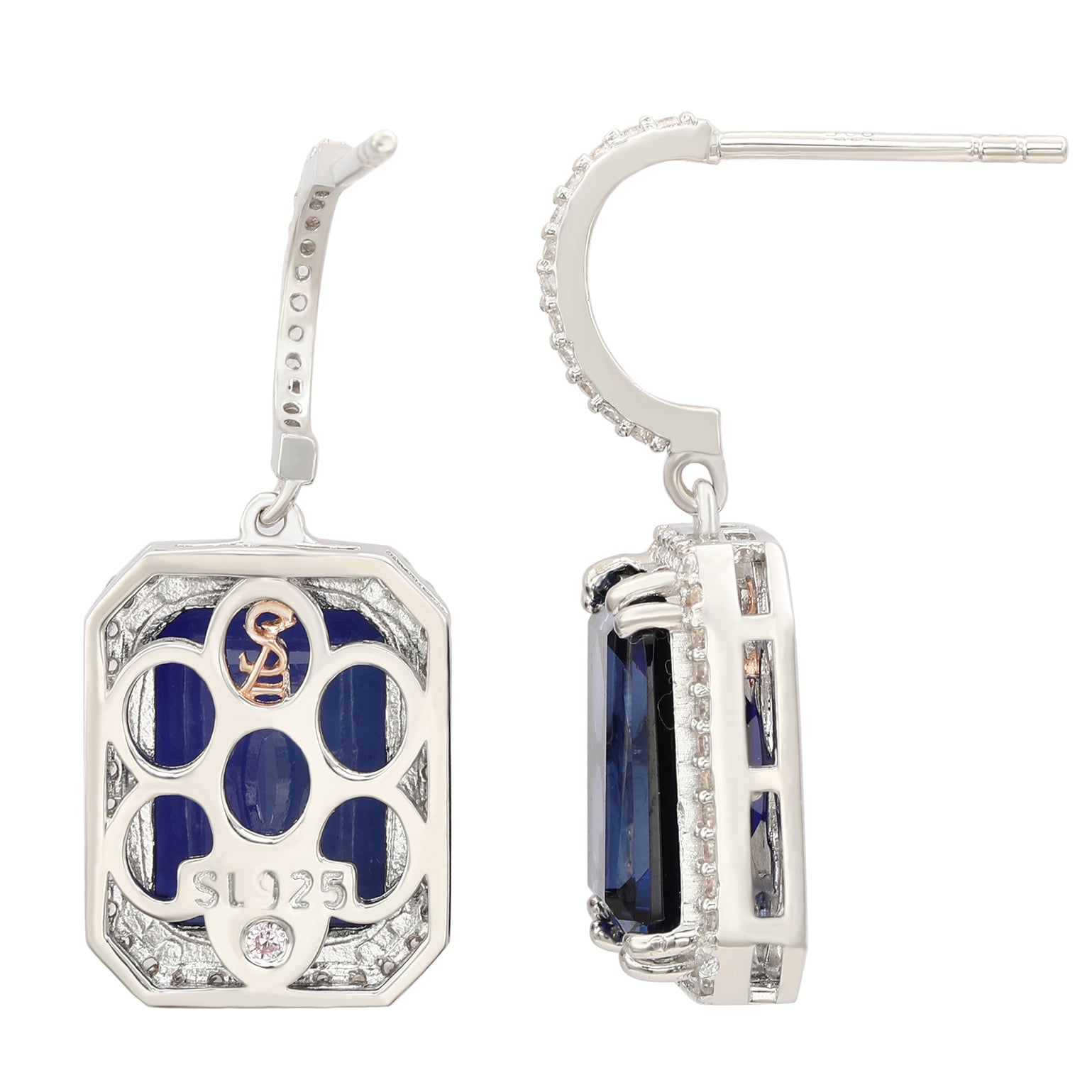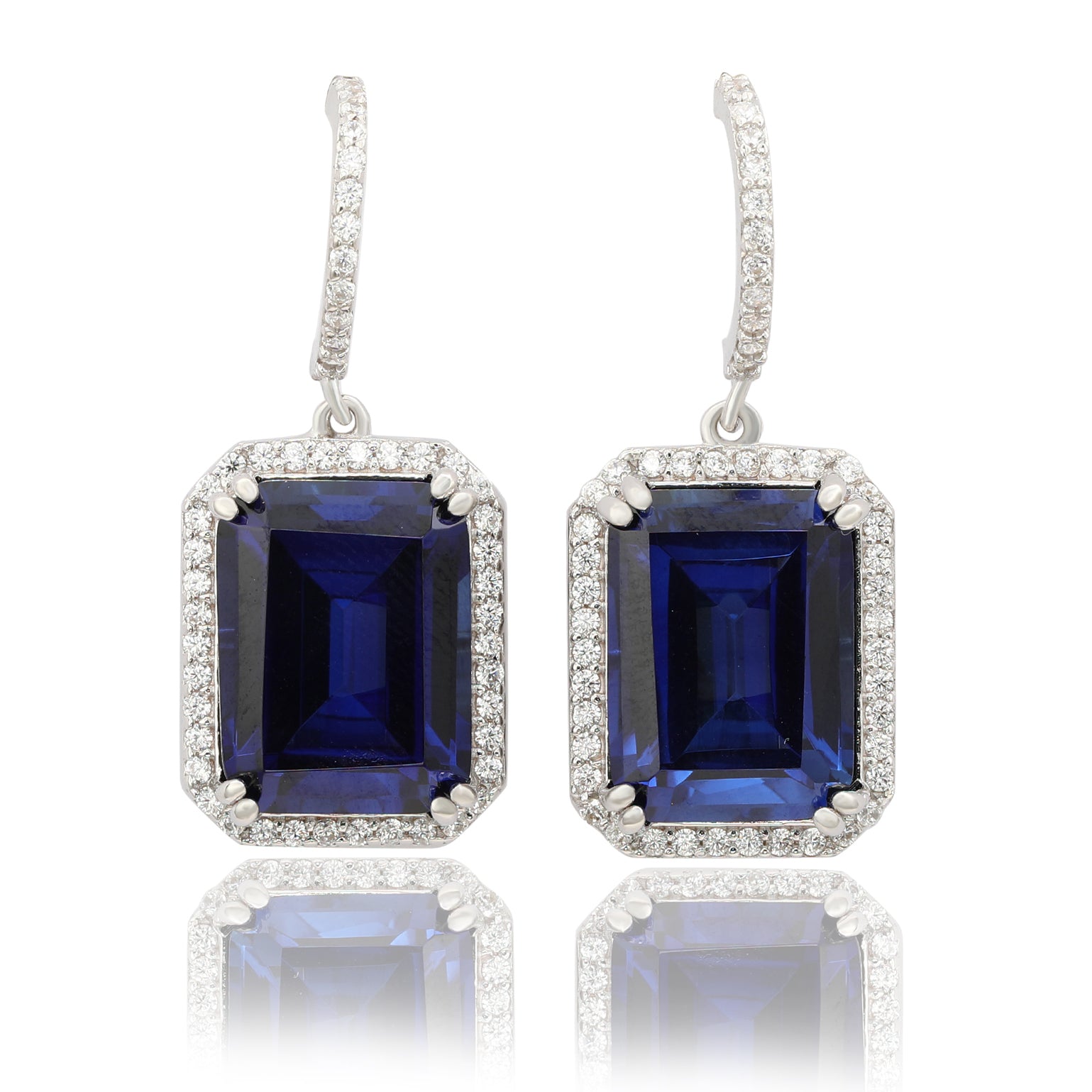 Timeless and always classy, with the right kick, these earrings are designed and crafted by Suzy Levian. These earrings feature two large emerald-cut blue cubic zirconia center stones that is surrounded by a halo of round cut white cubic zirconia's that are pave set giving the dangling earring that extra sparkle. These Suzy Levian earrings are made of high polished 925 sterling silver. These earrings are secured with a leverback closure for a snug-tight fit. These earrings are designed by Suzy Levian with a message. By creating jewelry that is beautiful inside and out, Suzy Levian's message is revealed through a hidden stone inside the back of the earrings to empower women to discover their inner strength, power and beauty. 'Together we can inspire the world to appreciate the diamond in ourselves.' - Suzy Levian