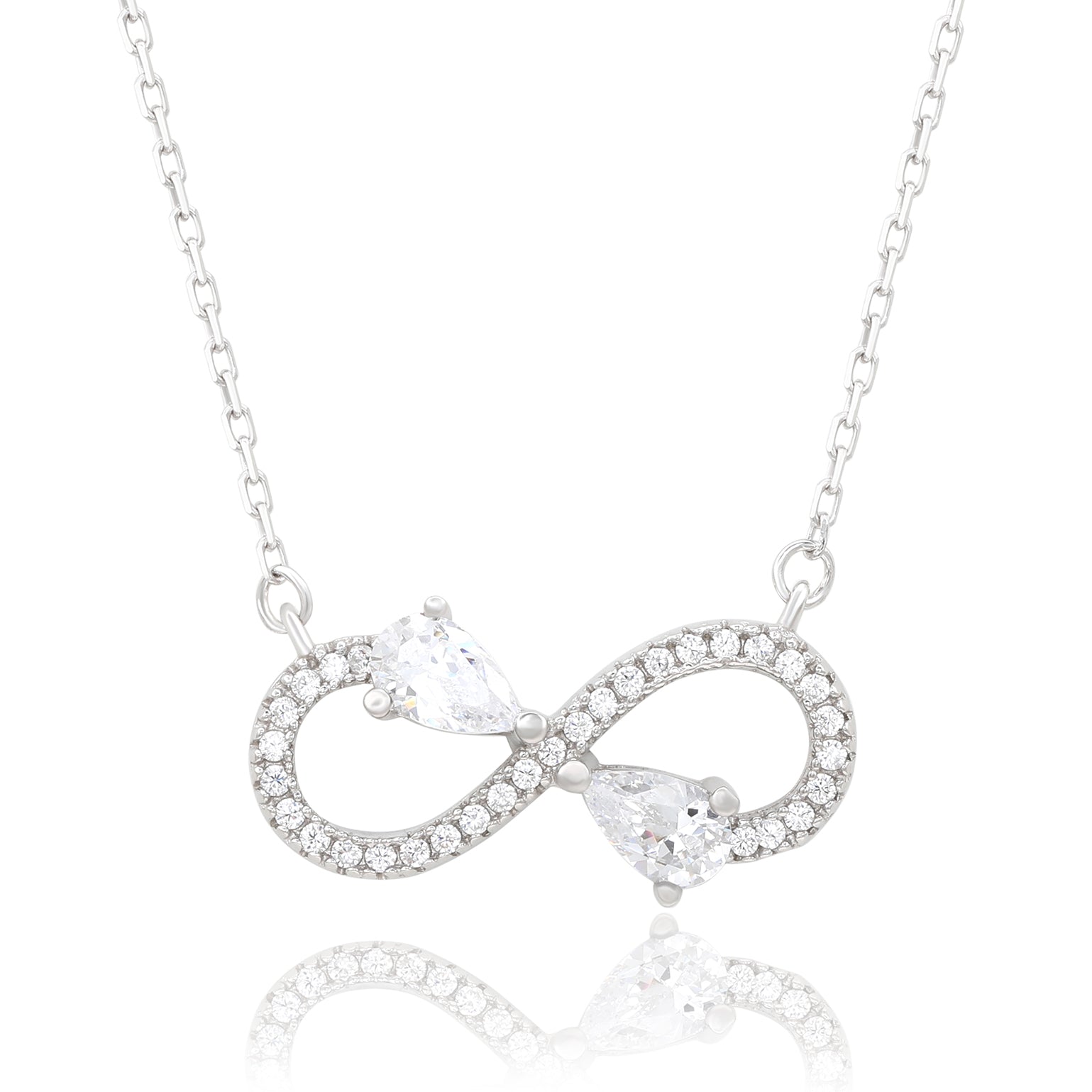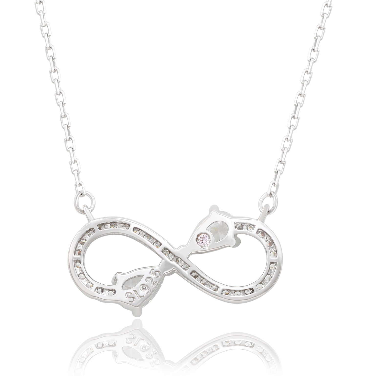 This elegant Suzy Levian necklace features both pave round cut white cubic zirconia's and two larger pear shape cubic zirconia's to create a gorgeous infinity necklace, all set in white sterling silver. The necklace is hung across an 18'' inch sterling silver cable chain and is secured with a spring ring clasp. It's subtle design flaunts your simple yet sophisticated style. This necklace is designed by Suzy Levian with a message. By creating jewelry that is beautiful inside and out, Suzy Levian's message is revealed through a hidden pink cubic zirconia set in the back of this pendant to empower women to discover their inner strength, power and beauty. 'Together we can inspire the world to appreciate the diamond in ourselves.' - S.L. This makes a great gift to give for a special loved one on any occasion, such as a graduation, birthday, holiday gift, bat- mitzvah or anniversary!