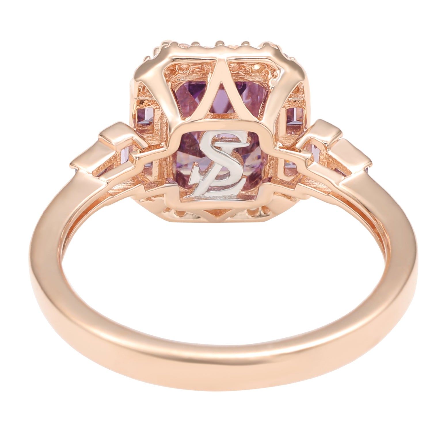 This beautiful Suzy Levian ring features a 6.8 mm emerald cut purple amethyst cubic zirconia center stone, framed with a pave halo of white round cut cubic zirconias accentuated by purple baguette cubic zirconia gemstones. This magnificent ring crafted of rose sterling silver with a high polish finish highlights the marvelous purple amethyst center stone. This ring is designed by Suzy Levian with a message. By creating jewelry that is beautiful inside and out, Suzy Levian's message is revealed through a hidden gemstone set inside the shank of this ring to empower women to discover their inner strength, power and beauty. This ring has a closed under-gallery with a two tone rose gold plating, highlighting Suzy Levian's SL logo. This dazzling ring looks delicate and elegant on your hand and is sure to draw the attention of all your family and friends.