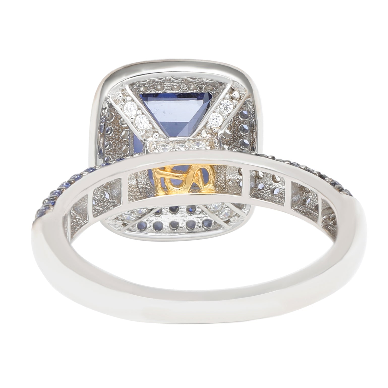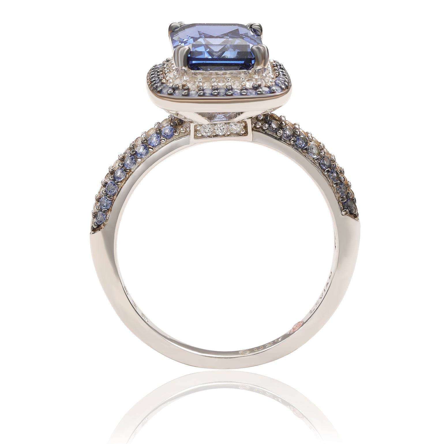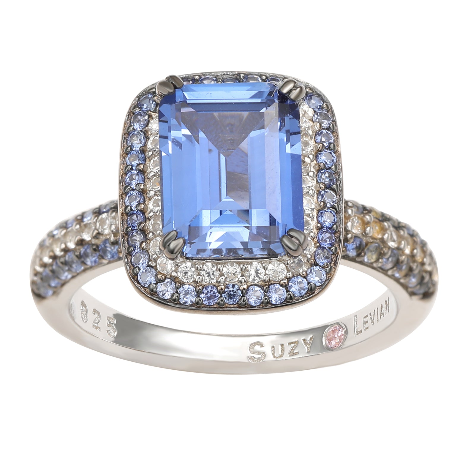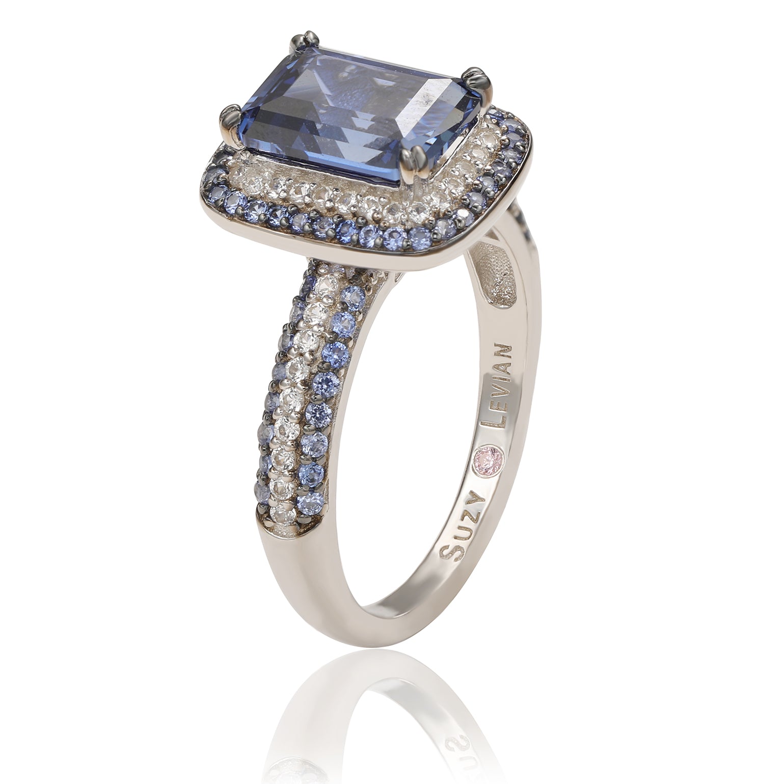 Enjoy sapphire hues with this beautiful bridal ring featuring a emerald cut blue sapphire center stone, surrounded by a double halo of created white sapphire and blue sapphire, accented with pave blue sapphire and created white sapphire stones continuing down the band of the ring. This beautiful Suzy Levian ring is designed for ladies looking for a unique addition to their jewelry collection, with an additional pop of color to your night-time ensemble! This ring is designed by Suzy Levian with a message. By creating jewelry that is beautiful inside and out, Suzy Levian's message is revealed through a hidden secret signature diamond (.02ct) set in the shank of this ring to empower women to discover their inner strength, power and beauty. This ring has a closed undergallery with an 18k yellow gold SL logo to highlight Suzy Levian's signature stamp. 'Together we can inspire the world to appreciate the diamond in ourselves.' - S.L.