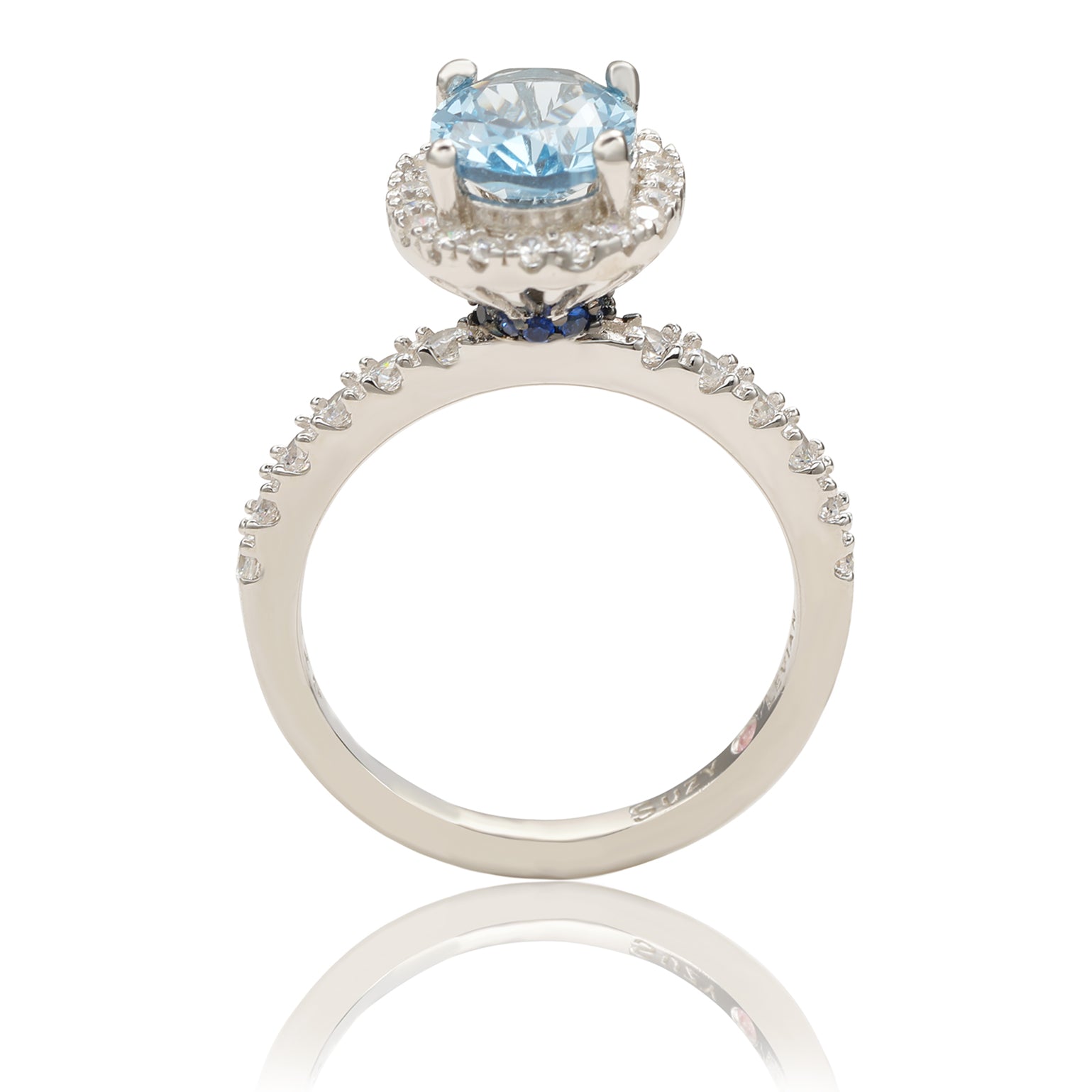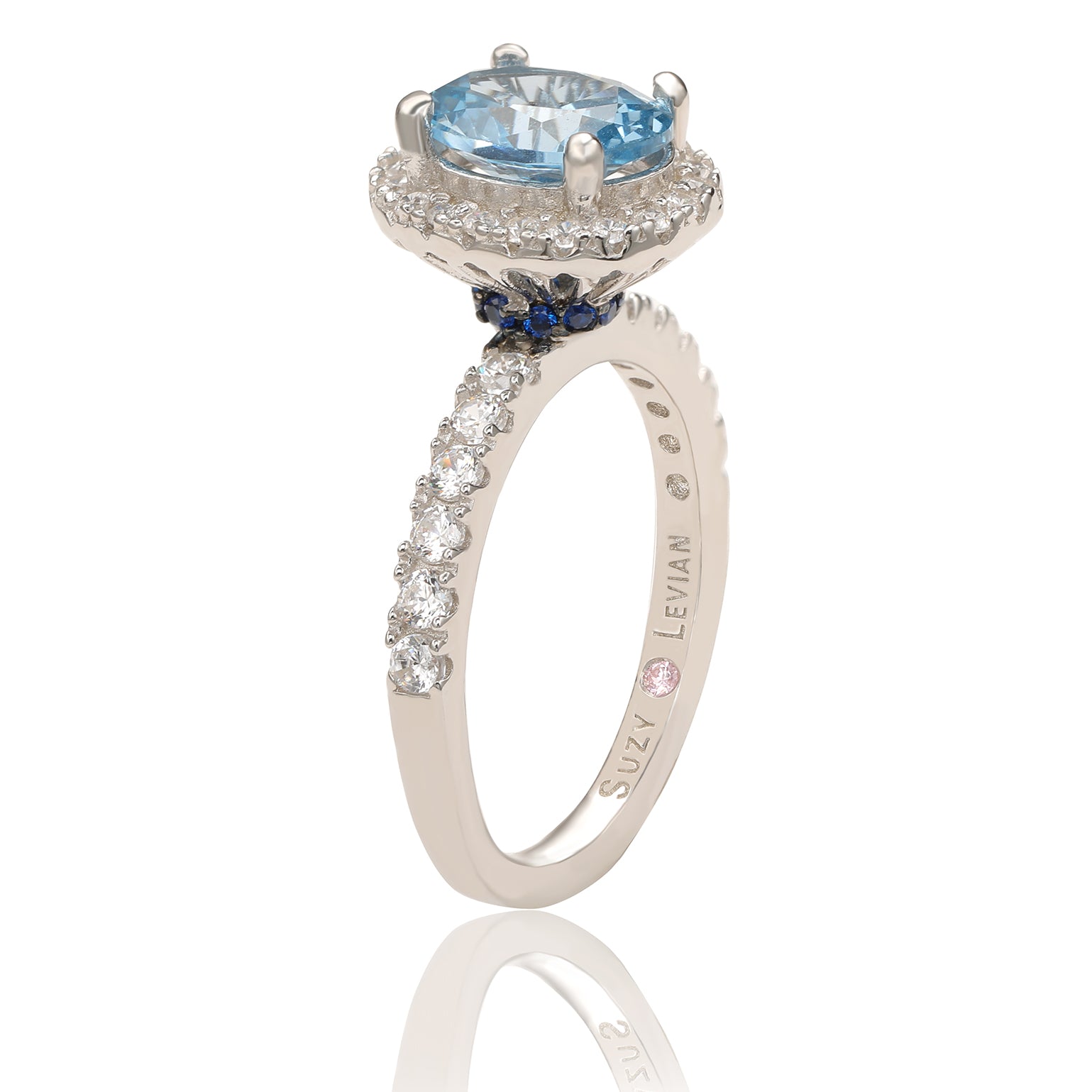 This breathtaking ring features an oval-cut aqua blue cubic zirconia center stone with a halo of round cut white cubic zirconia around it, with blue cubic zirconia accent border around the gallery, hand-set in sterling silver. This ring is designed by Suzy Levian with a message. By creating jewelry that is beautiful inside and out, Suzy Levian's message is revealed through a hidden stone set in the shank of this ring to empower women to discover their inner strength, power and beauty. This ring has a closed under-gallery with a two tone plating, highlighting Suzy Levian's SL logo.