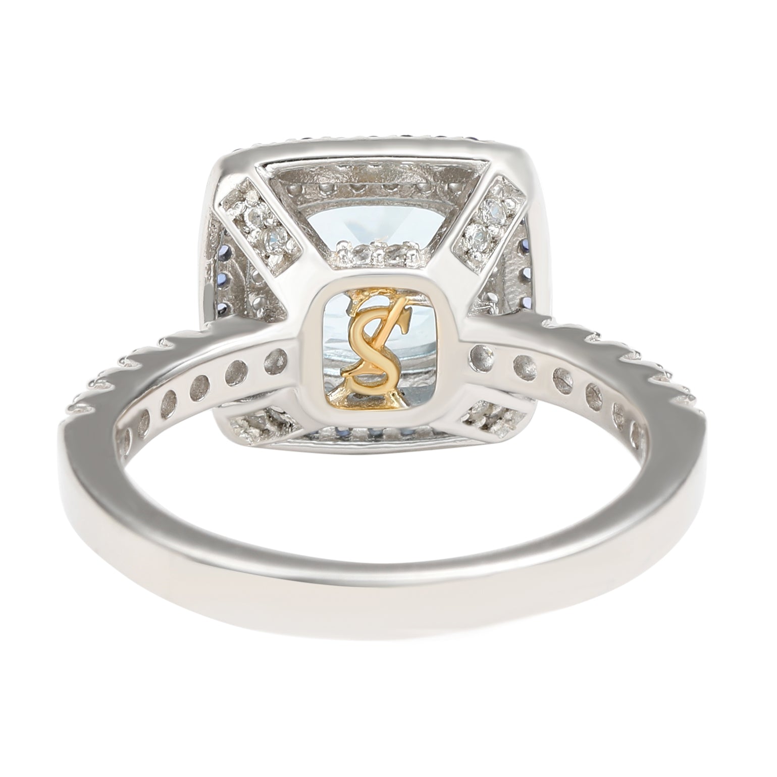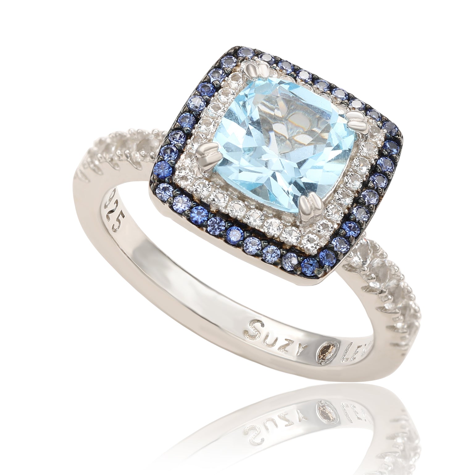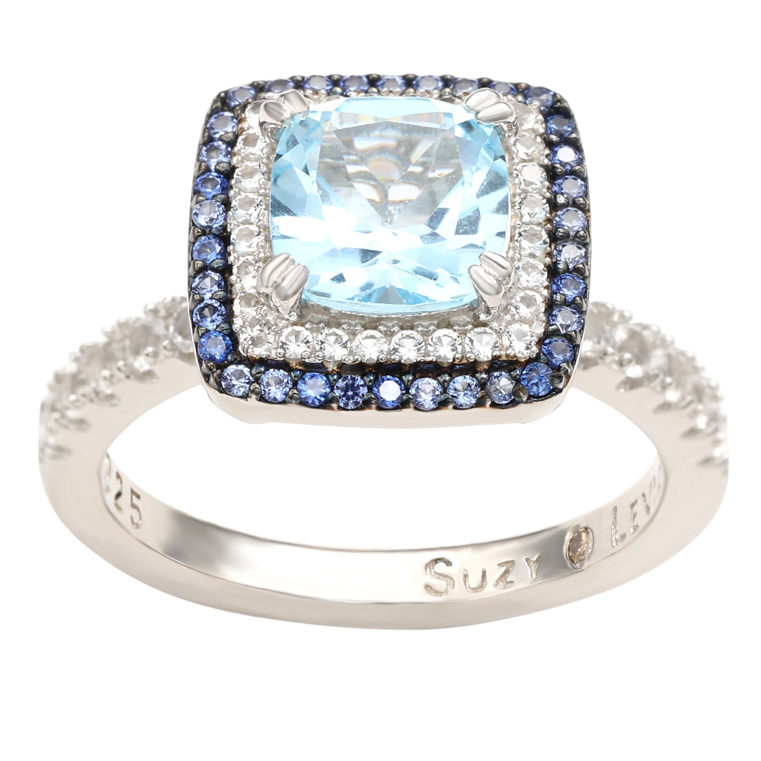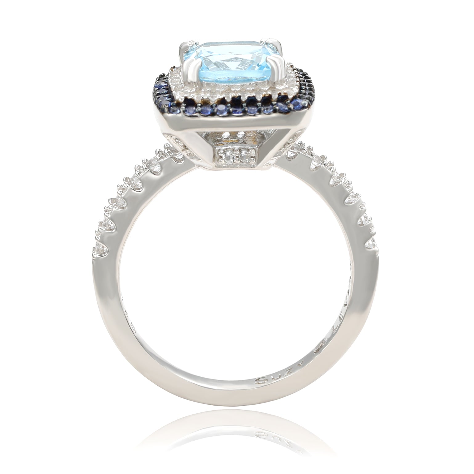 This Suzy Levian birthstone ring features a large cushion cut blue topaz gemstone center stone, with a double halo of sparkling white topaz, and blue sapphire gemstones. This ring makes a great birthday gift or addition to a personal jewelry collection. The band is constructed from sterling silver, making it durable and easy to clean. The high-shine polish of the piece is sure to draw attention at any cocktail party or special event. Suitable for any occasion, this ring adds dimension to any outfit. Be the topic of conversation by pairing this ring with an evening gown for a special occasion or your favorite pair of jeans for a night on the town. This dazzling ring looks delicate and elegant on your hand and is sure to draw the attention of your friends and family. This ring is designed by Suzy Levian with a message. By creating jewelry that is beautiful inside and out, Suzy Levian's message is revealed through a hidden white topaz gemstone set inside the shank of this ring to empower women to discover their inner strength, power and beauty. This ring has a closed under-gallery with two-tone plating, highlighting Suzy Levian's Suzy Levian logo.