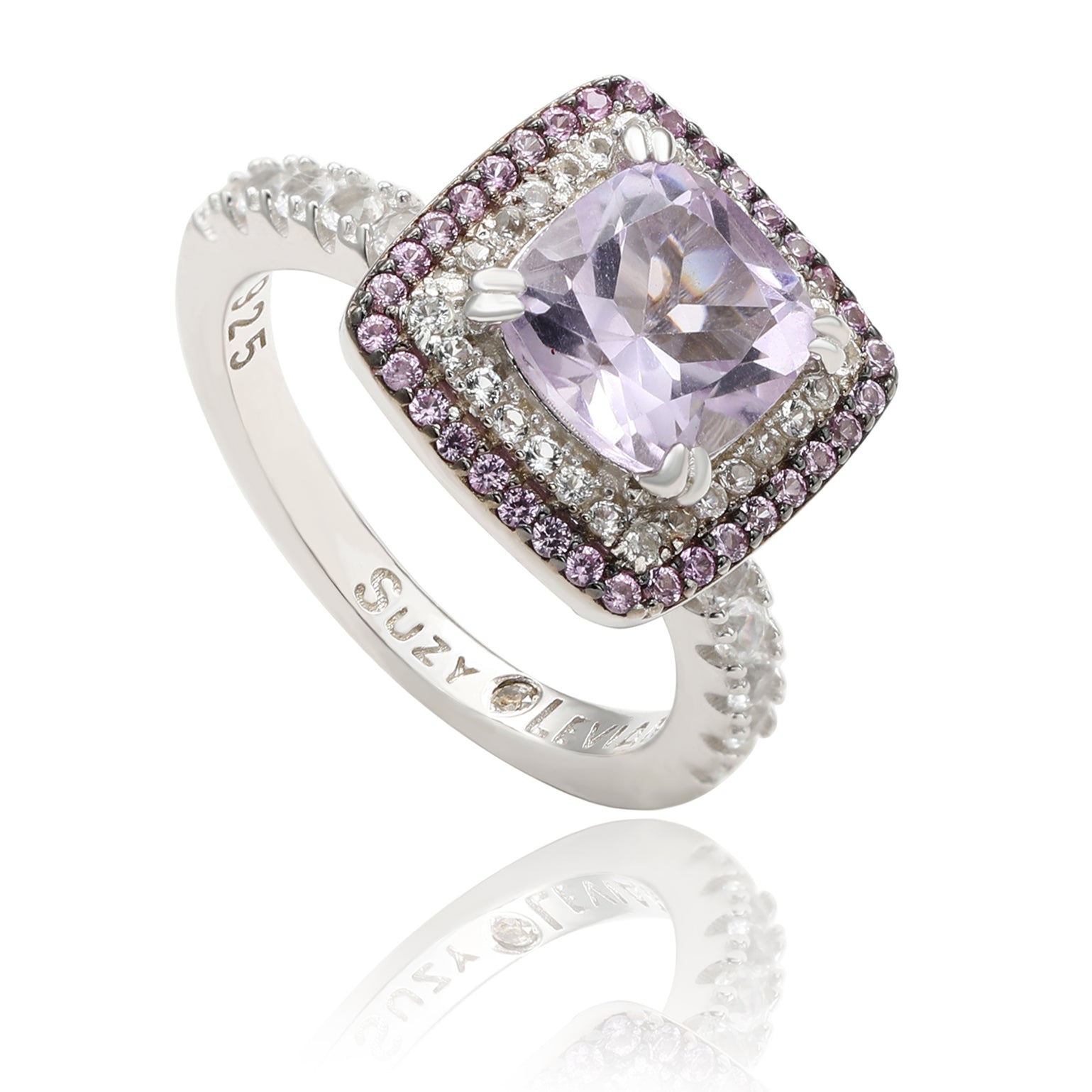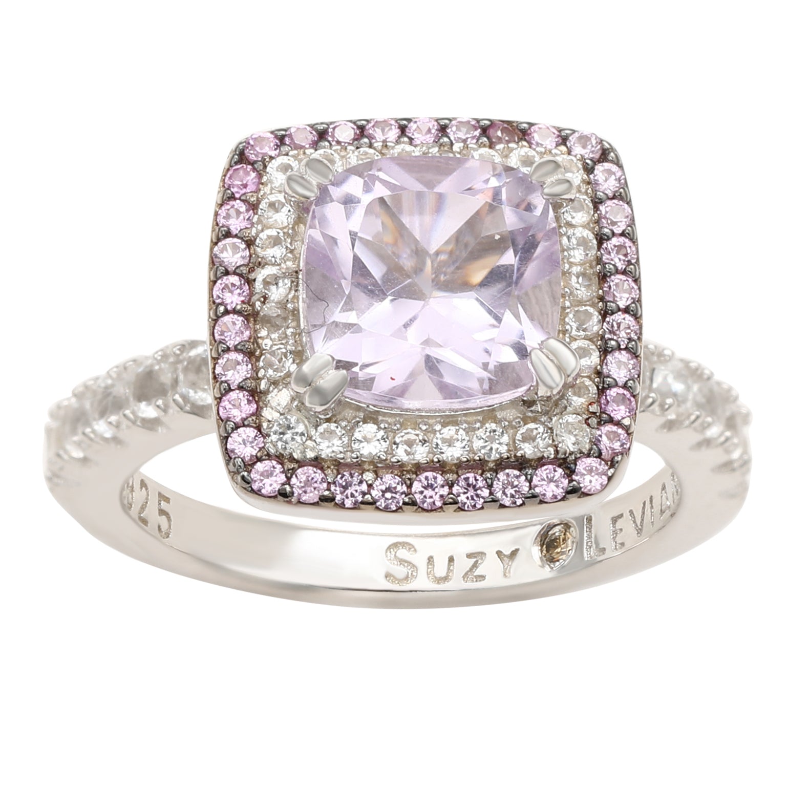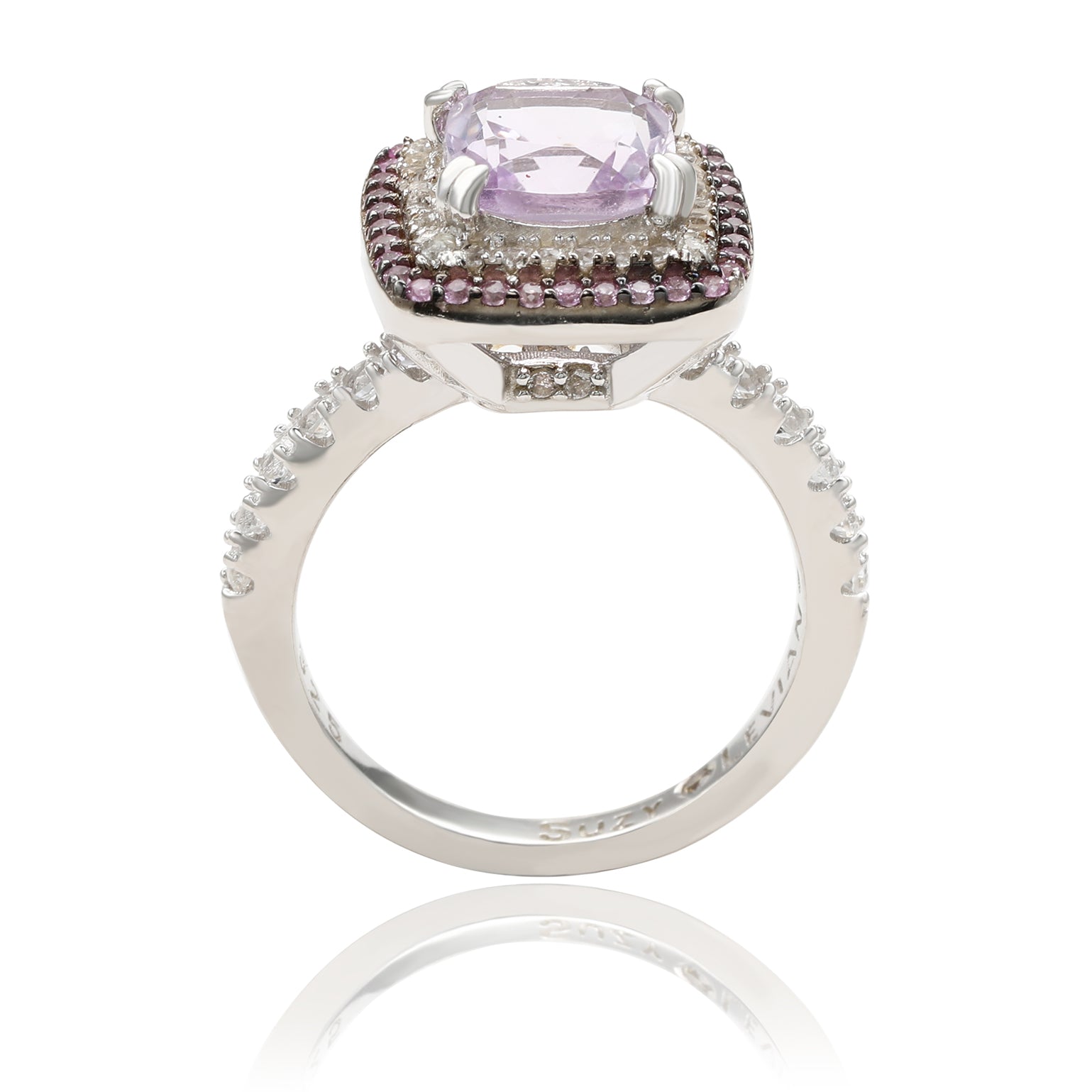 This Suzy Levian ring features a large, cushion-cut purple amethyst center stone, with a halo of sparkling white topaz and pink sapphire gemstones. This ring makes a great birthday gift or addition to a personal jewelry collection. The band is constructed from sterling silver, making it durable and easy to clean. The high-shine polish of the piece is sure to draw attention at any cocktail party or special event. Suitable for any occasion, this ring adds dimension to any outfit. Be the topic of conversation by pairing this ring with an evening gown for a special occasion or your favorite pair of jeans for a night on the town. This dazzling ring looks delicate and elegant on your hand and is sure to draw the attention of your friends and family. This ring is designed by Suzy Levian with a message. By creating jewelry that is beautiful inside and out, Suzy Levian's message is revealed through a hidden white topaz gemstone set inside the shank of this ring to empower women to discover their inner strength, power and beauty. This ring has a closed under-gallery with two-tone plating, highlighting Suzy Levian's Suzy Levian logo.