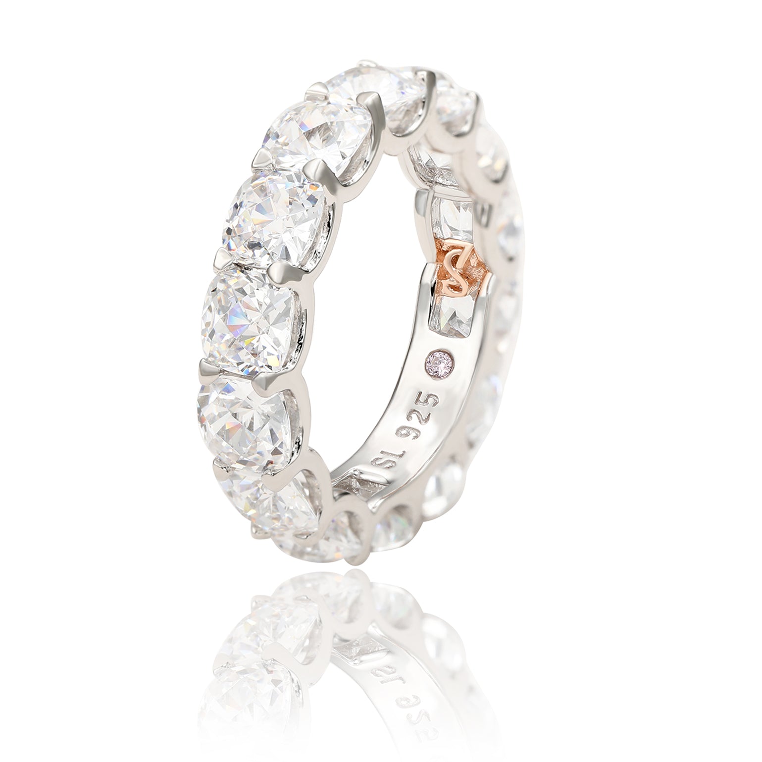 Stunning, timeless and classy eternity band ring. This brilliant ring is filled with rich, high quality checkered cushion cut white cubic zirconia gemstones, hand set in the trendiest, yet classy, setting called the U-shape in Suzy Levian's signature high polished 925 sterling silver. Every single ring is man made, making it a unique masterpiece. Surprise someone special in your life with this luxurious anniversary ring. Could be used as a wedding ring as well. Light-weighted and extremely shiny, every time your loved one will look at it, it will remind them that your love will lasts for all eternity! Suzy Levian guarantees the use of only high quality and top of the line materials, delivering for you and your loved one only the best. This ring is designed by Suzy Levian with a message. By creating jewelry that is beautiful inside and out, Suzy Levian's message is revealed through a hidden stone set in the shank of this ring to empower women to discover their inner strength, power and beauty. This ring has a closed under-gallery for comfort fit. 'Together we can inspire the world to appreciate the diamond in ourselves.' - Suzy Levian