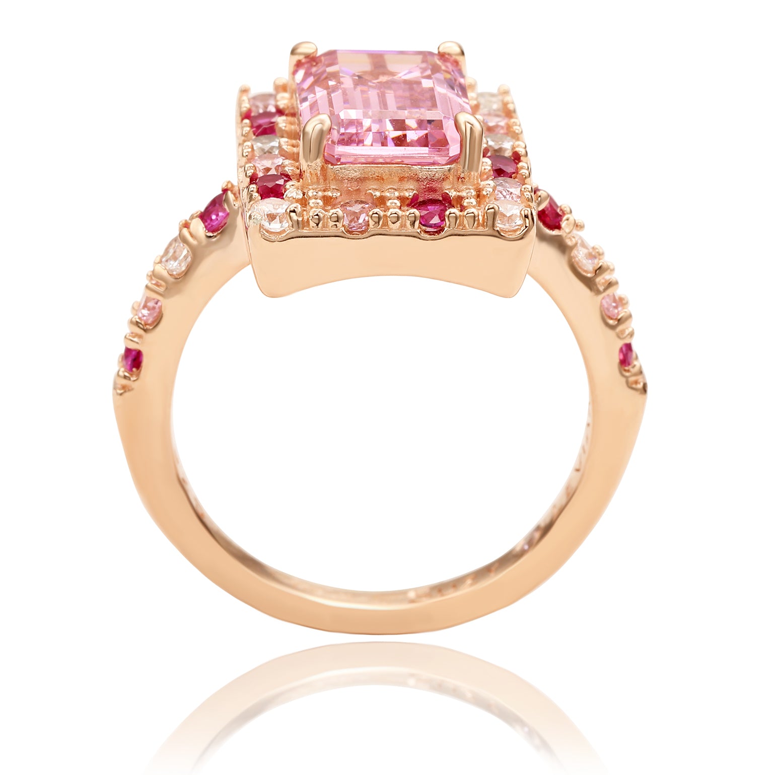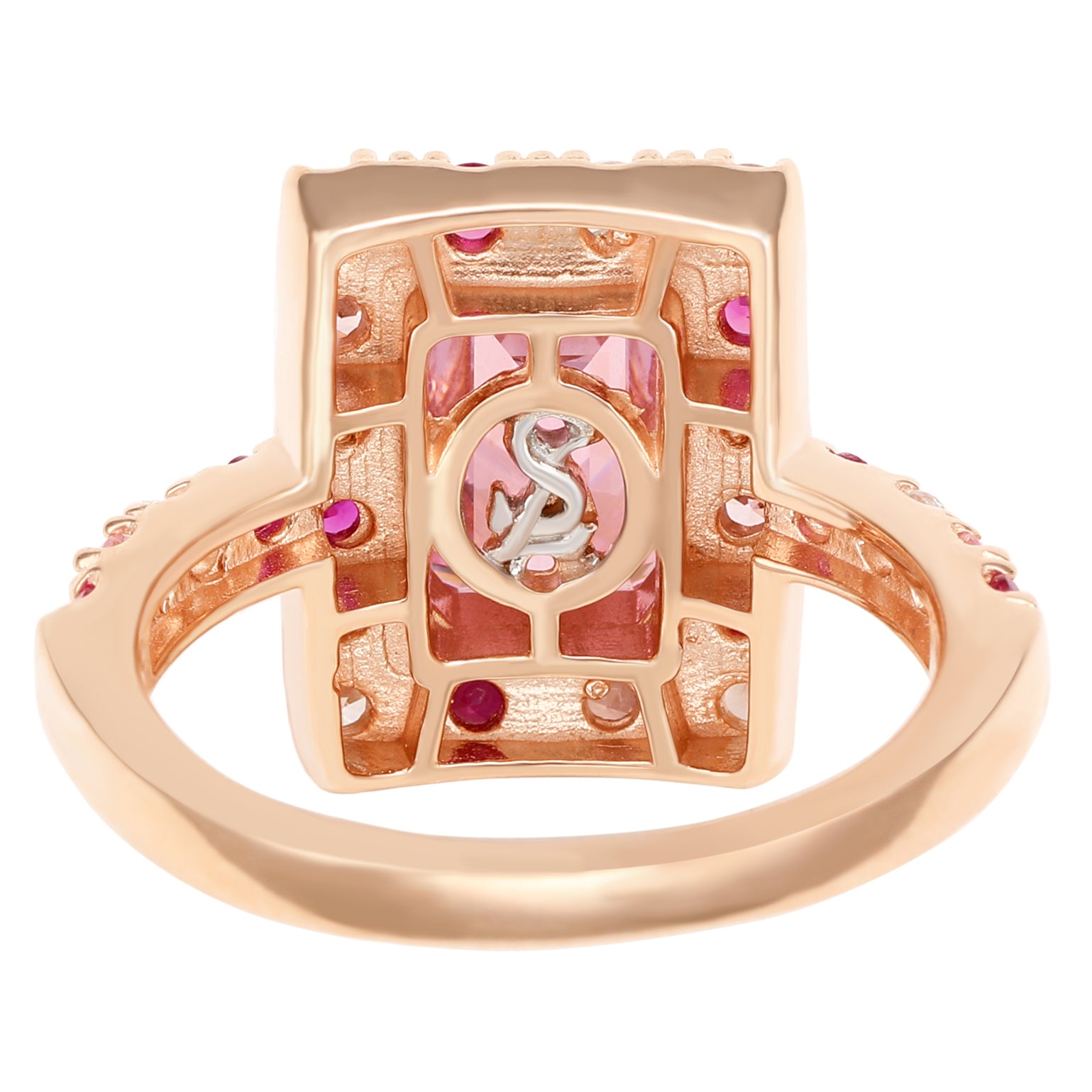 This gorgeous ring showcases an pink emerald-cut cubic zirconia stone in the center, accented by a halo of alternating white, pink, and fuschia cubic zirconias, additionally going halfway down the band of the ring. Crafted of 925 rose sterling silver each gem is delicately placed by hand to create a perfect look for every hand. The bold contrast of colors and grand design makes this ring a must-have. This ring is designed by Suzy Levian with a message. By creating jewelry that is beautiful inside and out, Suzy Levian's message is revealed through a hidden stone set in the shank of this ring to empower women to discover their inner strength, power and beauty. This ring has a closed under-gallery with a two tone rose gold plating, highlighting Suzy Levian 's SL logo.