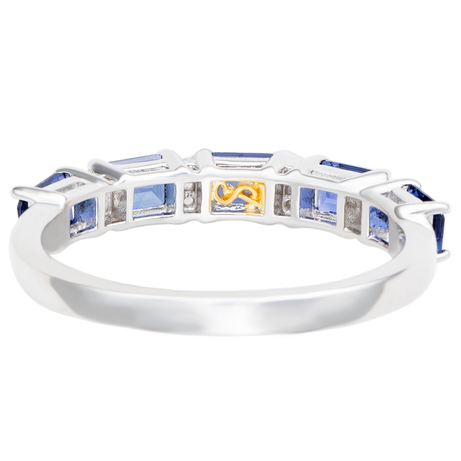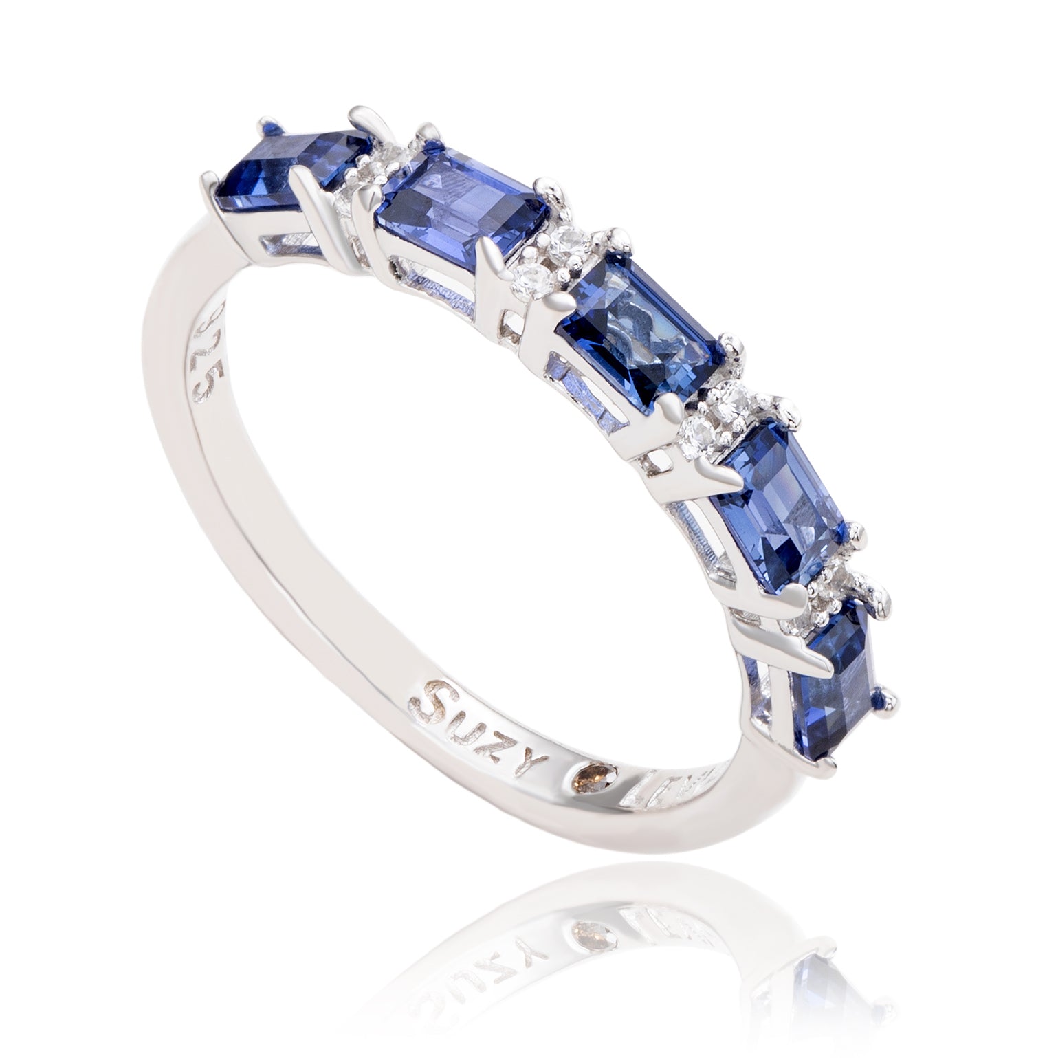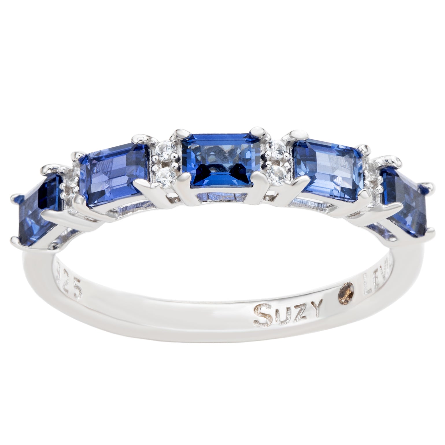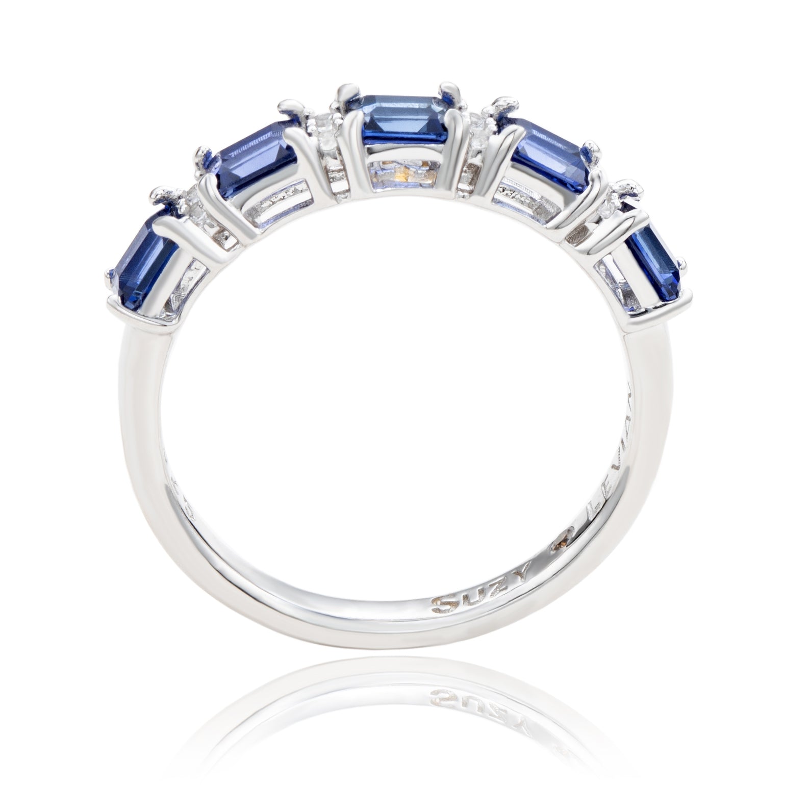 Stunning, timeless and classy half eternity band ring. This ring is filled with rich, high quality gemstones, featuring emerald-cut blue sapphires, prong-set with alternating smaller round white created white sapphires, hand set in 925 sterling silver. Every single ring is hand made, making it a unique masterpiece. Surprise someone special in your life with this luxurious anniversary ring. Or even better, this could be the perfect birthday gift. Treat someone to a ring that's not only strikingly gorgeous but reminds your special someone that your love will lasts for all eternity. This ring is designed by Suzy Levian with a message. By creating jewelry that is beautiful inside and out, Suzy Levian's message is revealed through a hidden brown fancy diamond (.02 ct) set inside the band of this ring to empower women to discover their inner strength, power and beauty. This ring has a closed under-gallery for comfort fit with a two-tone finish, highlighting Suzy Levian's yellow gold plated logo. 'Together we can inspire the world to appreciate the diamond in ourselves.' - Suzy Levian
