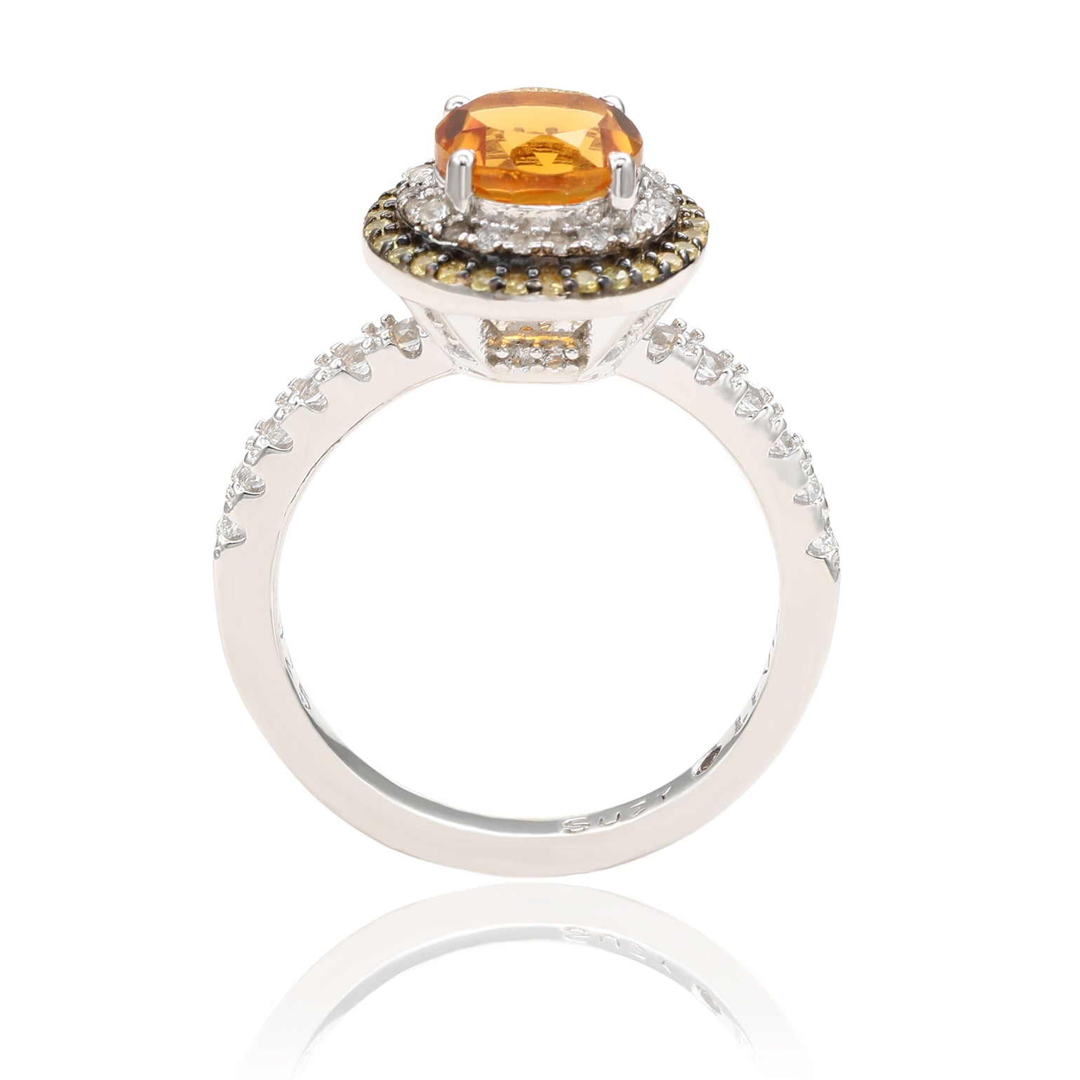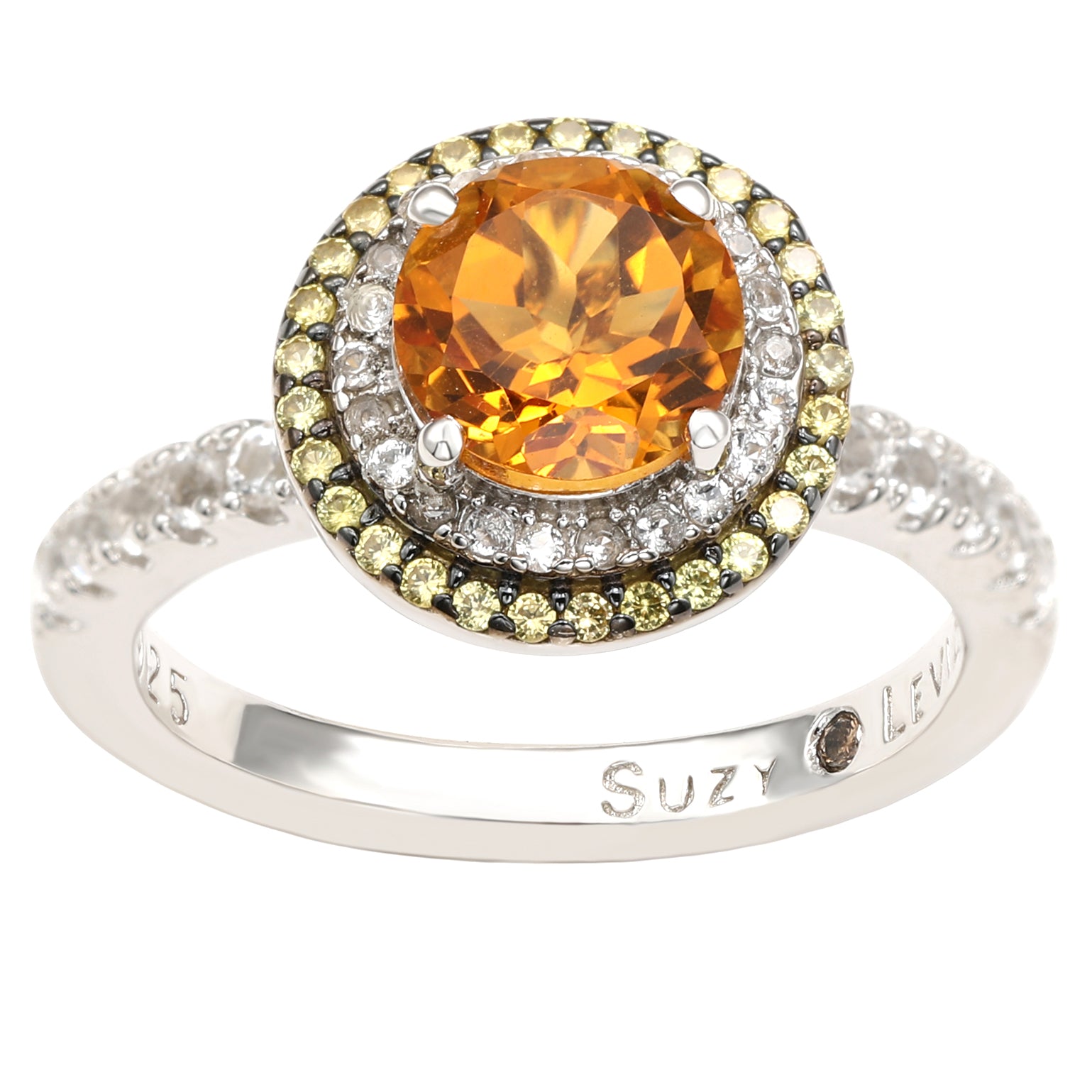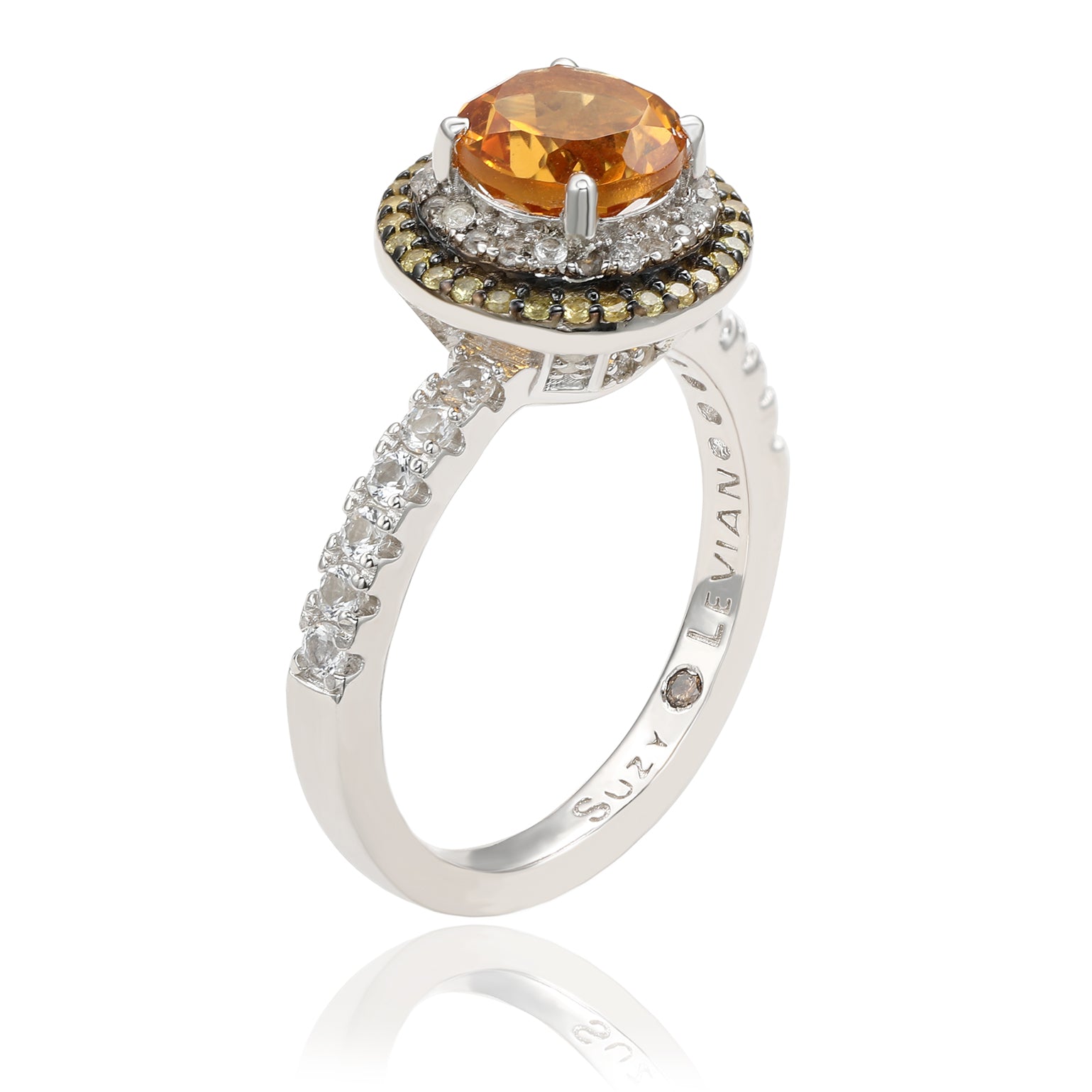 This Suzy Levian ring features a large, round-cut orange citrine center stone with a double halo of white topaz, and yellow sapphire gemstones. This ring makes a great birthday gift or addition to a personal jewelry collection. The band is constructed from sterling silver, making it durable and easy to clean. The high-shine polish of the piece is sure to draw attention at any cocktail party or special event. Suitable for any occasion, this ring adds dimension to any outfit. Be the topic of conversation by pairing this ring with an evening gown for a special occasion or your favorite pair of jeans for a night on the town. This dazzling ring looks delicate and elegant on your hand and is sure to draw the attention of your friends and family. This ring is designed by Suzy Levian with a message to share. By creating jewelry that is beautiful inside and out, Suzy Levian's message is revealed through a hidden white topaz gemstone set inside the shank of this ring to empower women to discover their inner strength, power and beauty. This ring has a closed under-gallery with two-tone plating, highlighting Suzy Levian's SL logo. The closed under-gallery adds a smooth comfort fit.