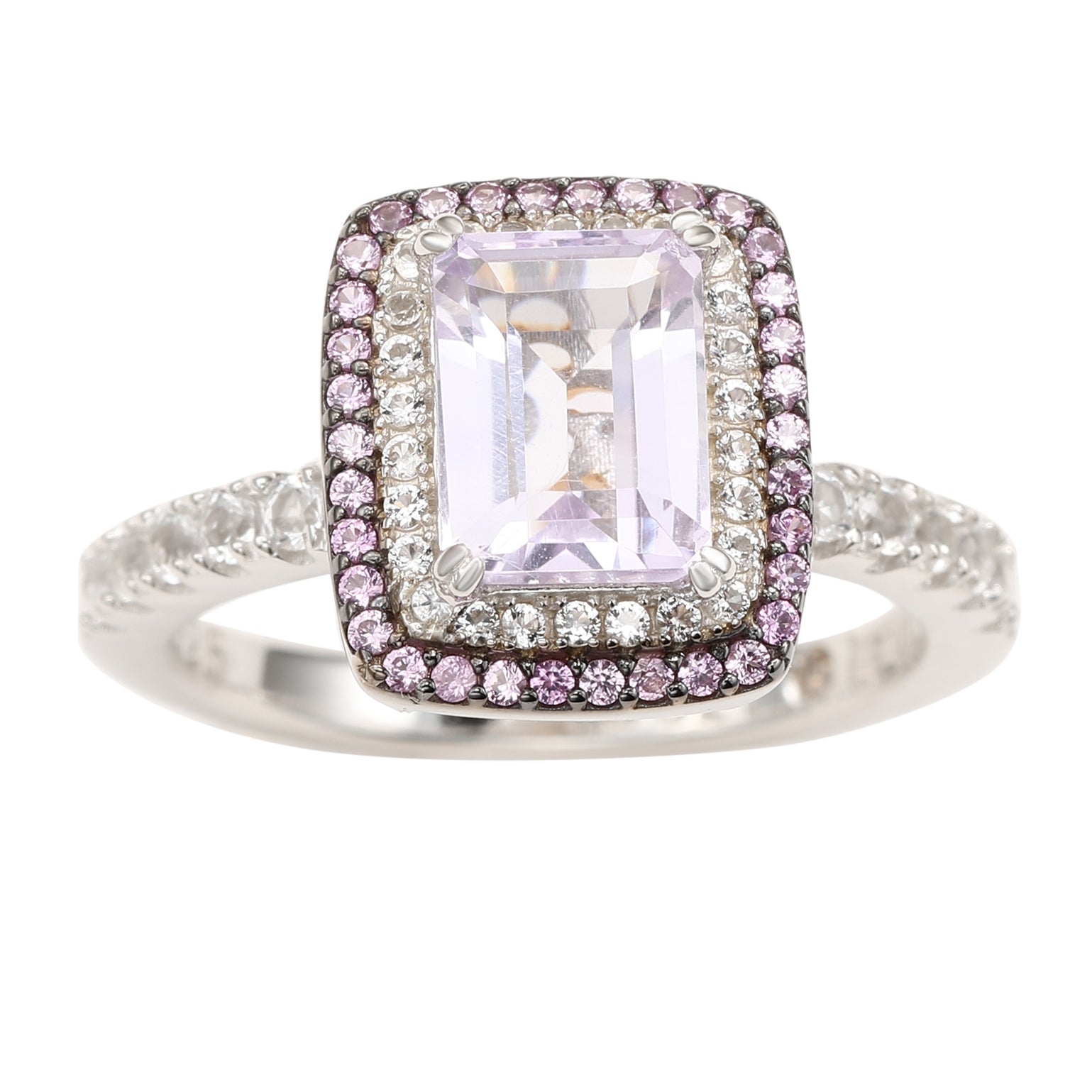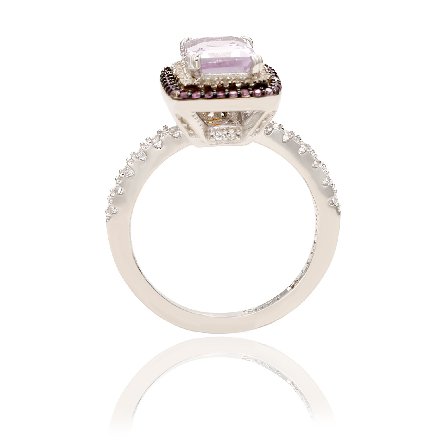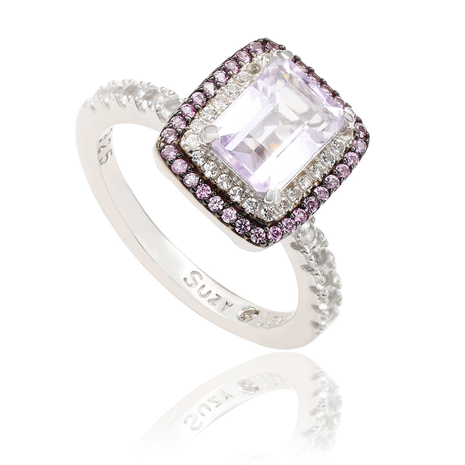 This Suzy Levian birthstone ring features a large emerald cut purple amethyst gemstone center stone, with a double halo of sparkling white topaz, and pink sapphire gemstones. This ring makes a great birthday gift or addition to a personal jewelry collection. The band is constructed from sterling silver, making it durable and easy to clean. The high-shine polish of the piece is sure to draw attention at any cocktail party or special event. Suitable for any occasion, this ring adds dimension to any outfit. Be the topic of conversation by pairing this ring with an evening gown for a special occasion or your favorite pair of jeans for a night on the town. This dazzling ring looks delicate and elegant on your hand and is sure to draw the attention of your friends and family. This ring is designed by Suzy Levian with a message. By creating jewelry that is beautiful inside and out, Suzy Levian's message is revealed through a hidden white topaz gemstone set inside the shank of this ring to empower women to discover their inner strength, power and beauty. This ring has a closed under-gallery with two-tone plating, highlighting Suzy Levian's Suzy Levian logo.