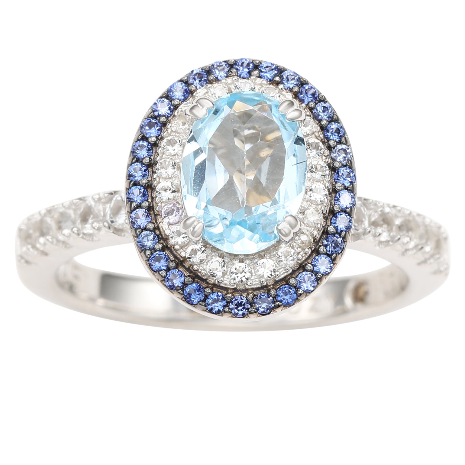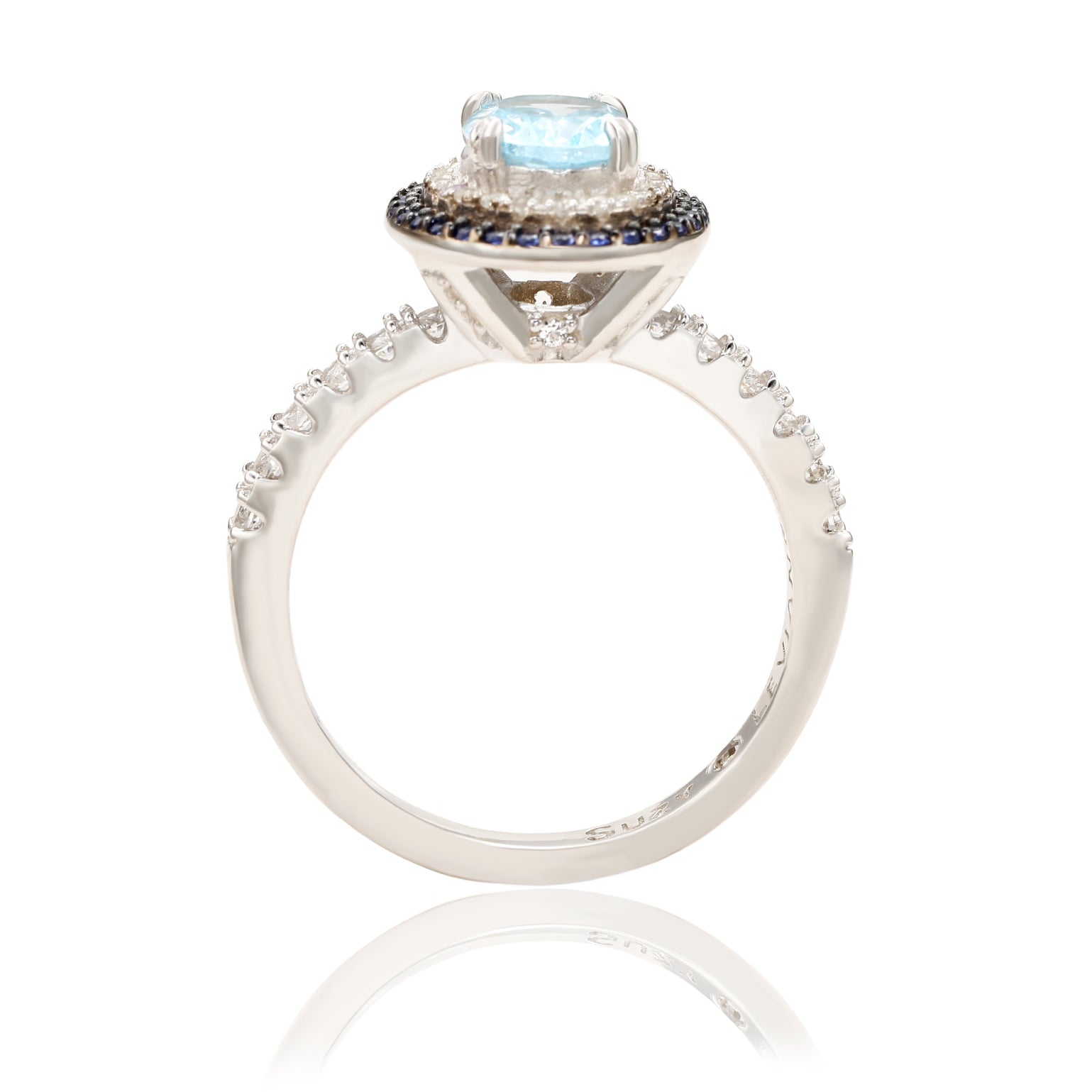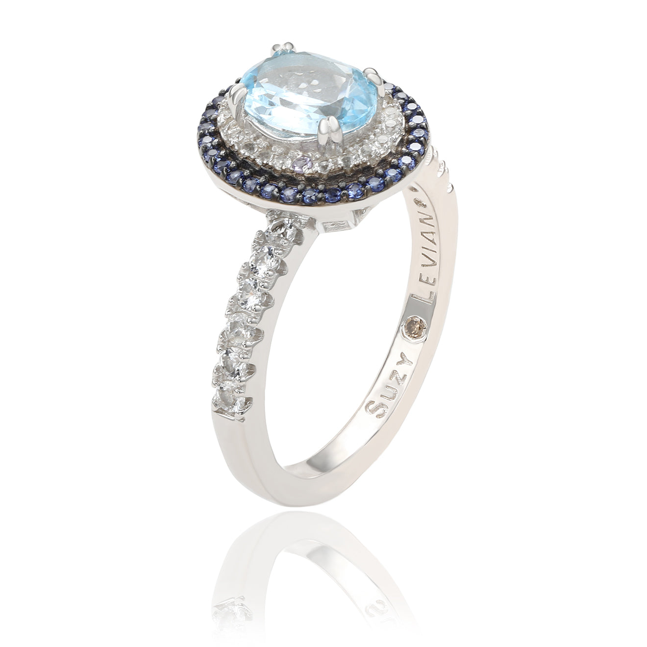 This Suzy Levian birthstone ring features a large oval cut blue topaz gemstone center stone, with a double halo of sparkling white topaz, and blue sapphire gemstones. This ring makes a great birthday gift or addition to a personal jewelry collection. The band is constructed from sterling silver, making it durable and easy to clean. The high-shine polish of the piece is sure to draw attention at any cocktail party or special event. Suitable for any occasion, this ring adds dimension to any outfit. Be the topic of conversation by pairing this ring with an evening gown for a special occasion or your favorite pair of jeans for a night on the town. This dazzling ring looks delicate and elegant on your hand and is sure to draw the attention of your friends and family. This ring is designed by Suzy Levian with a message. By creating jewelry that is beautiful inside and out, Suzy Levian's message is revealed through a hidden white topaz gemstone set inside the shank of this ring to empower women to discover their inner strength, power and beauty. This ring has a closed under-gallery with two-tone plating, highlighting Suzy Levian's Suzy Levian logo.