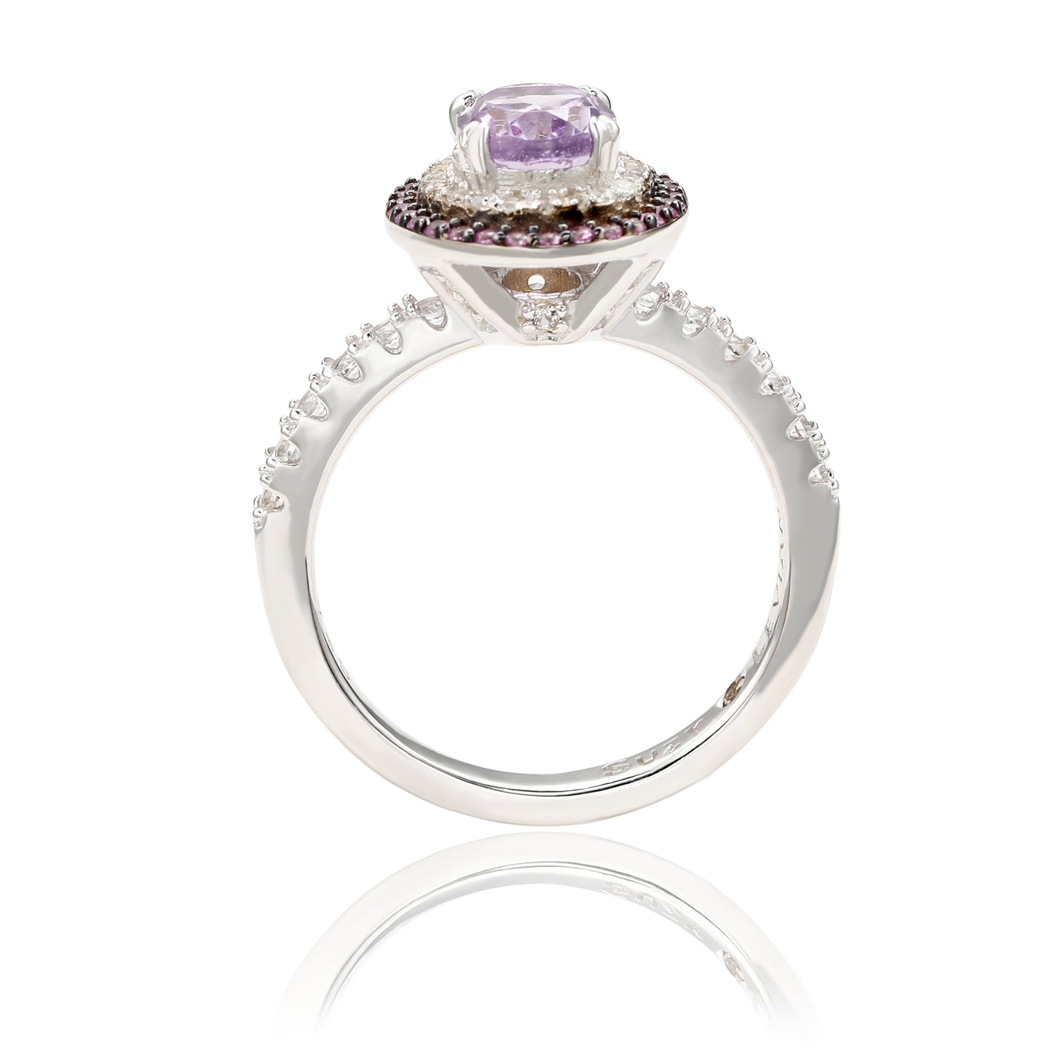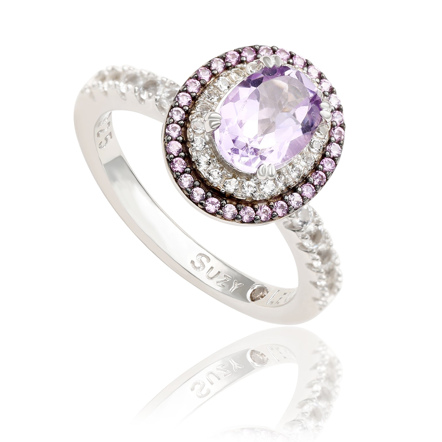 This Suzy Levian birthstone ring features a large oval cut purple amethyst gemstone center stone, with a double halo of sparkling white topaz, and pink sapphire gemstones. This ring makes a great birthday gift or addition to a personal jewelry collection. The band is constructed from sterling silver, making it durable and easy to clean. The high-shine polish of the piece is sure to draw attention at any cocktail party or special event. Suitable for any occasion, this ring adds dimension to any outfit. Be the topic of conversation by pairing this ring with an evening gown for a special occasion or your favorite pair of jeans for a night on the town. This dazzling ring looks delicate and elegant on your hand and is sure to draw the attention of your friends and family. This ring is designed by Suzy Levian with a message. By creating jewelry that is beautiful inside and out, Suzy Levian's message is revealed through a hidden white topaz gemstone set inside the shank of this ring to empower women to discover their inner strength, power and beauty. This ring has a closed under-gallery with two-tone plating, highlighting Suzy Levian's Suzy Levian logo.