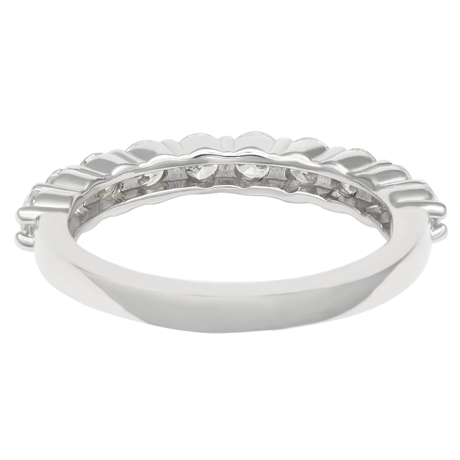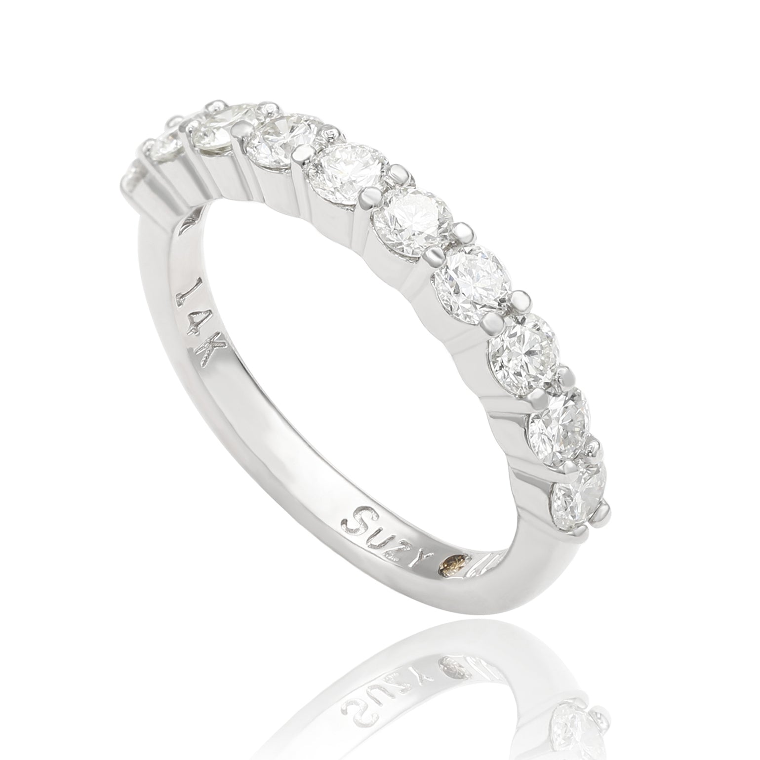 This elegant Suzy Levian diamond half eternity band features a total of ten round cut diamonds (G-H, S1-S2). The diamonds sparkle along half the eternity band, for a sparkle you can't miss with a comfort fit. Designed by Suzy Levian , this 14k white gold half eternity band features a high polish finish. Adorn your hand or the hand of a loved one with 1 carat total weight of diamonds that come together in a glorious display of vibrancy. This ring is eye-catching on its own or can also set off your engagement ring. Remind yourself of your love and commitment every time you look at this elegant ring. This ring packs an impressive amount of elegance into its sturdy prong settings. The low profile keeps your diamonds safe and prevents snagging on fabrics. The most popular diamond cut for engagement rings, round-cut diamonds exceed all other cuts in brilliance and sparkle. White gold is often used to enhance diamonds and other gemstones. These diamonds have a G-H, S1-S2, quality, and sit in a 14k gold setting