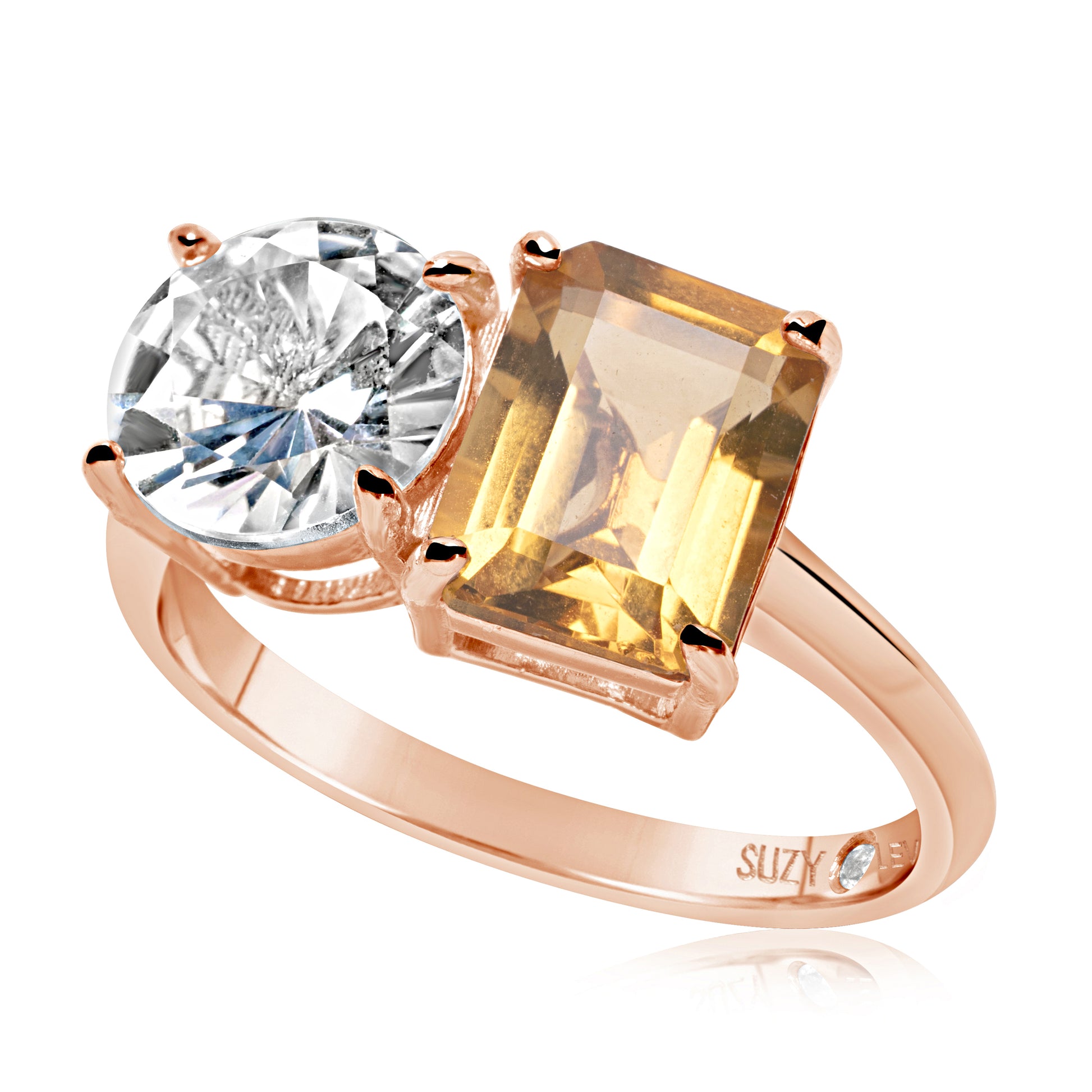 Shimmering in hues of white and orange, this Suzy Levian ring is as on trend as can be, and features a round cut white topaz and an emerald cut orange citrine as a perfectly matched pair. This ring symbolizes a perfect pairing of unique shapes. This ring is constructed from rose sterling silver, making it durable and easy to clean. The high-shine polish of the piece is sure to draw attention at any cocktail party or special event. Suitable for any occasion, this ring adds dimension to any outfit. Be the topic of conversation by pairing this ring with an evening gown for a special occasion or your favorite pair of jeans for a night on the town. This ring is designed by Suzy Levian with a message to share. By creating jewelry that is beautiful inside and out, Suzy Levian's message is revealed through a hidden white topaz gemstone set inside the shank of this ring to empower women to discover their inner strength, power and beauty. This ring has a closed under-gallery with two-tone plating, highlighting Suzy Levian's SL logo. The closed under-gallery adds a smooth comfort fit.
