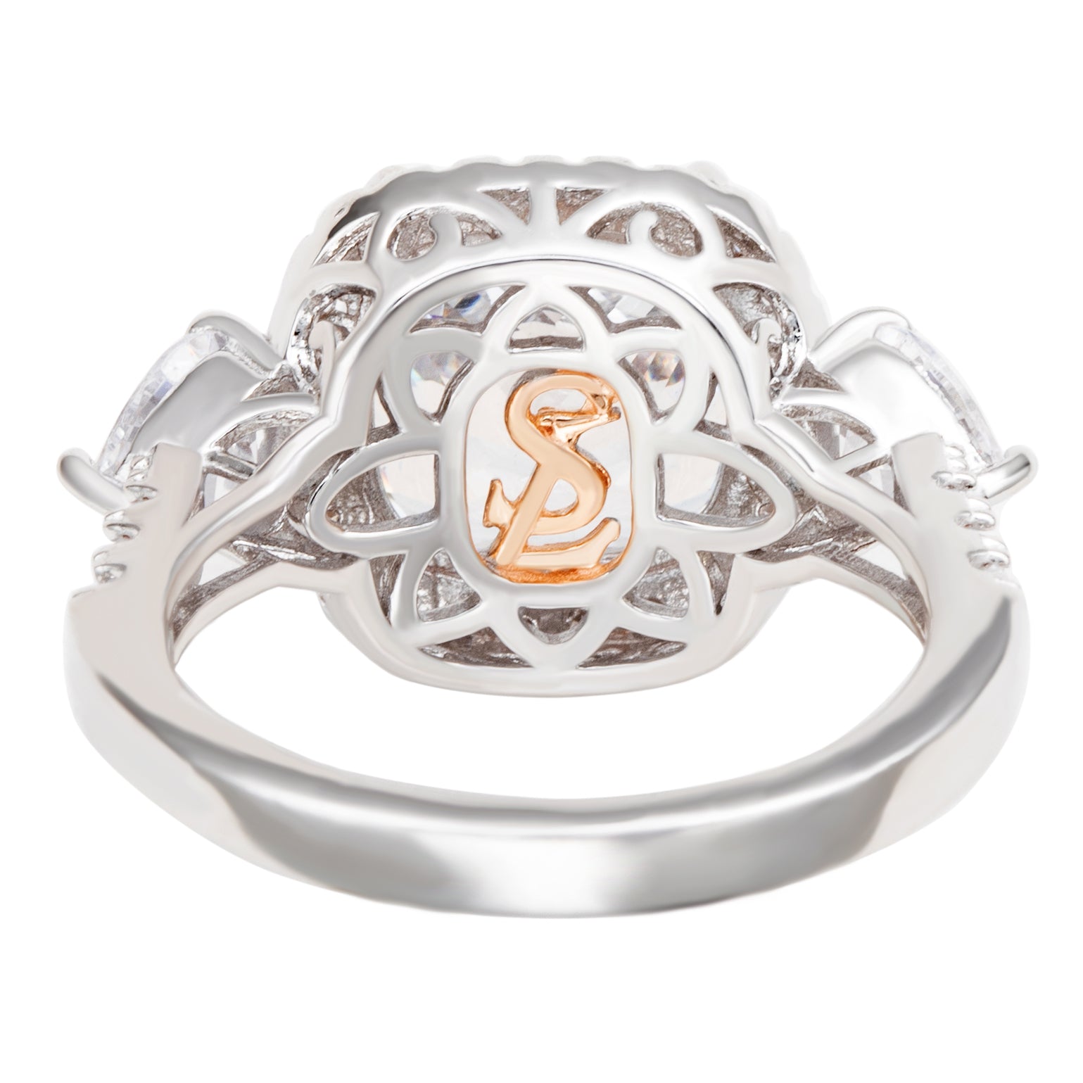 It's a taste you can see! Add a classy and elegant element to your style. This sophisticated ring features a large cushion-cut white cubic zirconia center stone with a pave halo of round cut white cubic zirconia around it, along with two heart shape cubic zirconia side stone, and round cubic zirconias going halfway down the band. For a perfect finish this ring is hand set in sterling silver with a high polish finish. This ring is designed by Suzy Levian with a message. By creating jewelry that is beautiful inside and out, Suzy Levian's message is revealed through a hidden pink cubic zirconia set in the shank of this ring to empower women to discover their inner strength, power and beauty. This ring has a closed under-gallery for comfort fit with a two-tone setting, highlighting Suzy Levian SL logo in rose plating. 'Together we can inspire the world to appreciate the diamond in ourselves.' - Suzy Levian