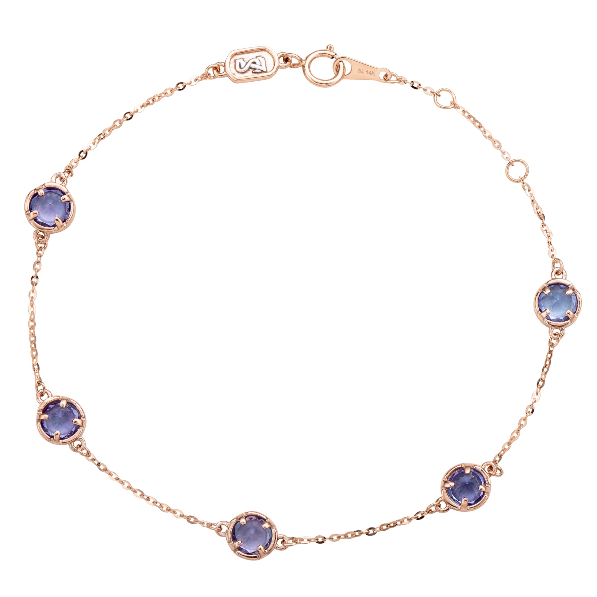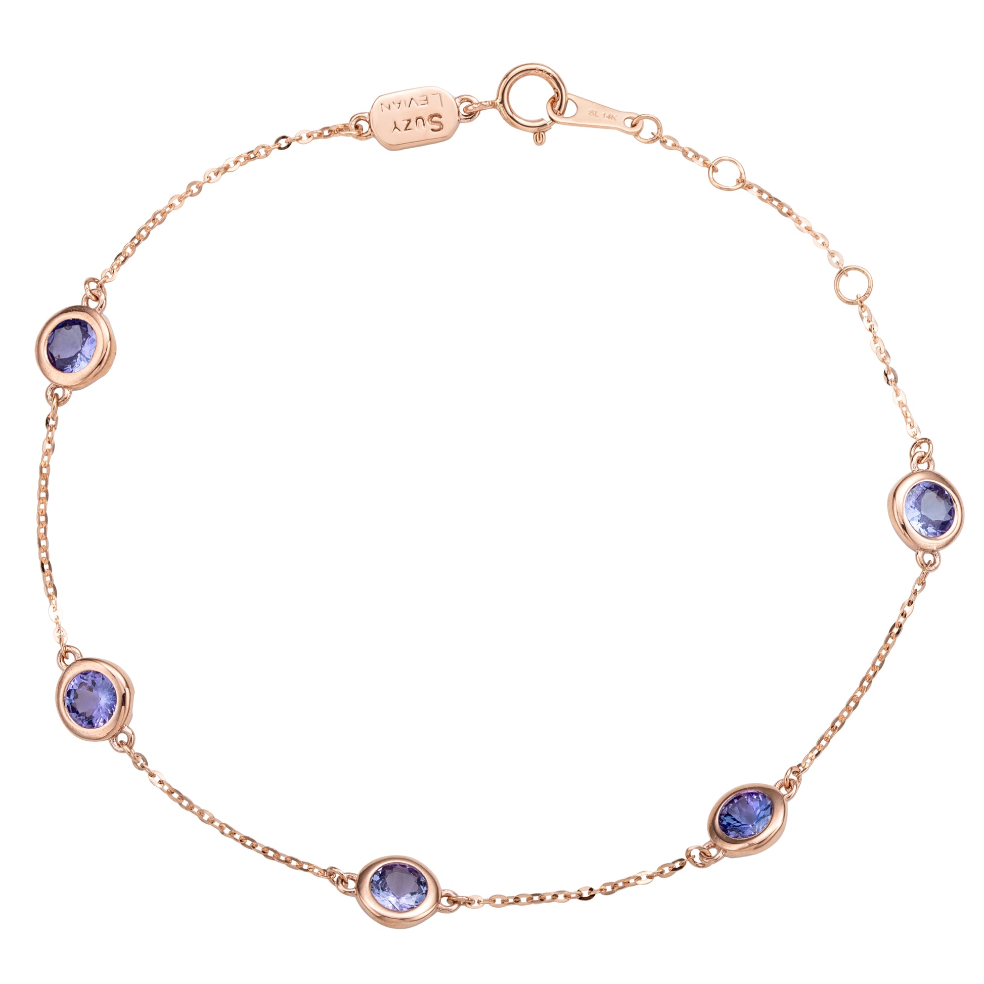 Adorn your hand with sparkling shimmers with this beautiful genuine tanzanite station bracelet. This bracelet can be worn stackable with other bracelets or as a single bracelet, making it the perfect bracelet for every occasion. This bracelet features five round-cut vibrant genuine tanzanite that is a total of 1.25 cttw, and are bezel set in 14K rose gold. This Bracelet is 7" in length, and showcases sparkle & shine from every angle. This bracelet has a spring ring closure with a unique plaque embracing Suzy Levian's 14K yellow gold SL logo. By creating jewelry that is beautiful inside and out. A high polish finish completes the look. This makes a great gift to give for a special loved one on any occasion, such as graduation, birthdays, holiday gift, bat- mitzvahs, and anniversaries!