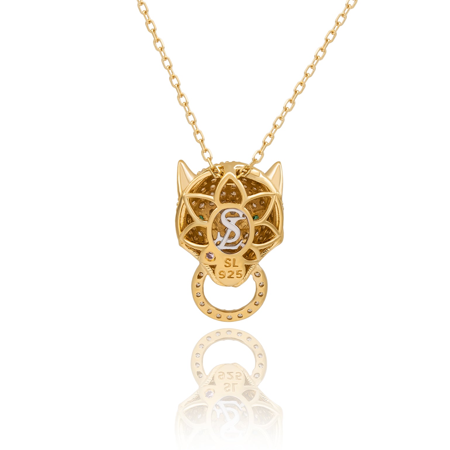 Fierce and Fabulous, this eye-catching pendant, featuring sparkling white pave cubic zirconia's along the panthers three dimensional face and ring hanging from the mouth, with gazing green cubic zirconia colored eyes, hand set in yellow sterling silver. This pendant has a closed Suzy Levian designer back-gallery, additionally the pendant comes with an 18 inch yellow sterling silver chain with a spring ring clasp. It is the perfect pendant to express the fierce woman inside of you!