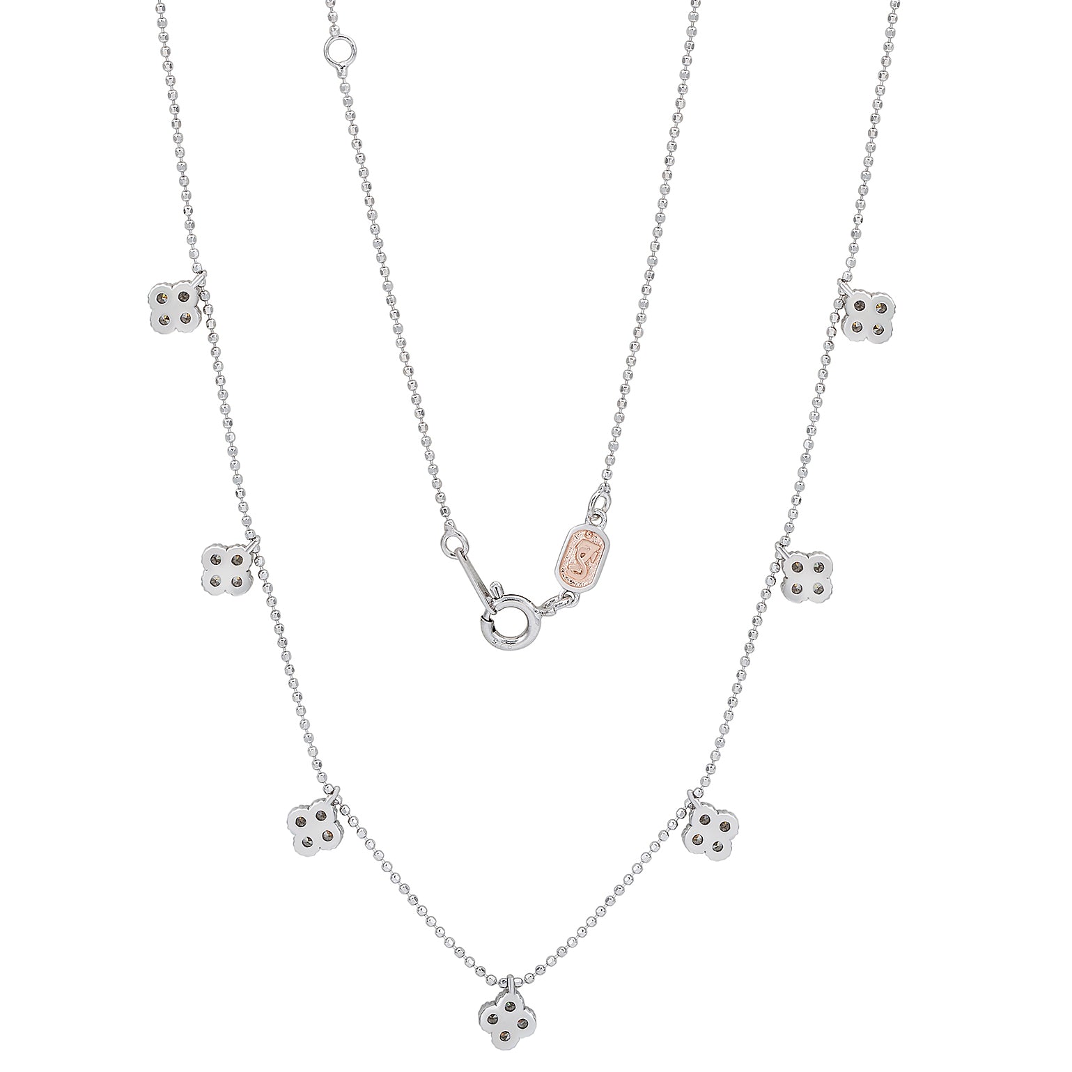With elegance and subtlety, this Suzy Levian clover drop station necklace, has become an icon of class, luxury and style. This necklace features an elegant box ball chain station necklace with five whimsical hanging drop clovers motifs, that whispers the message that happiness renews itself everyday. Each Suzy Levian creation is handcrafted and made of 925 sterling silver, high quality and carefully selected white cubic zirconia, providing our customers with the finest accessories. This necklace locks with a spring ring closure to ensure a safe and secure fit the whole time it's on your neck. There is a plaque next to clasp with a signature white gold plated SL logo and a Signature Secret Stone.