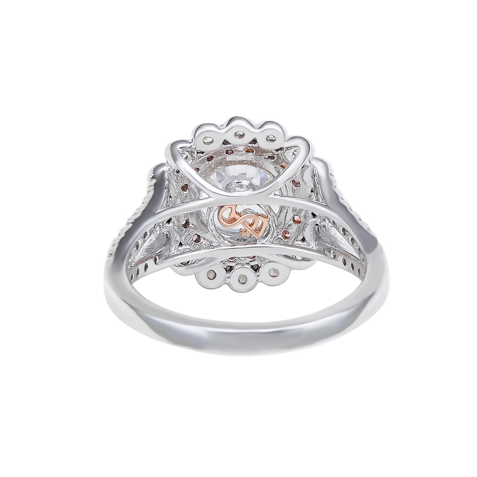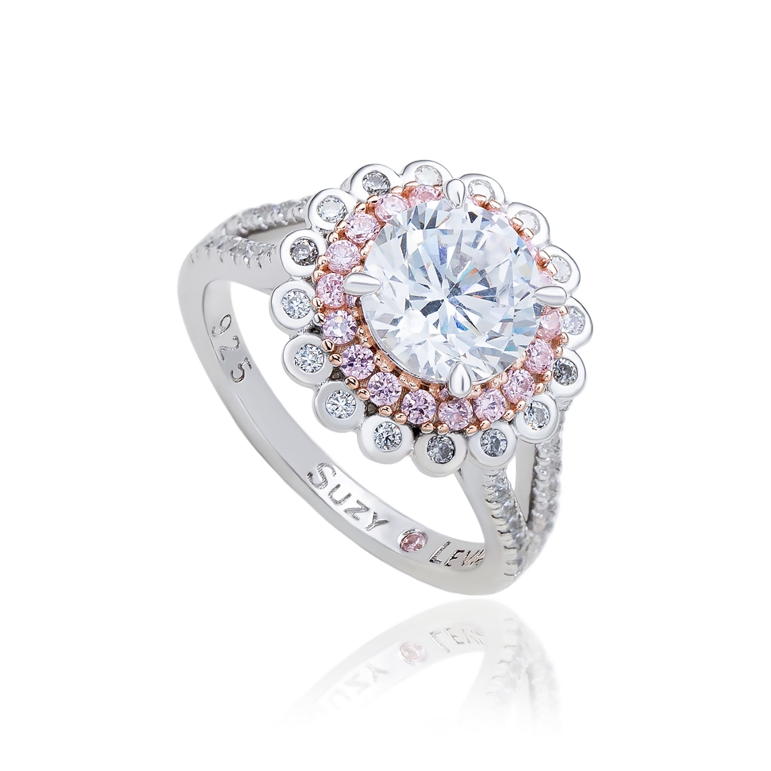 This sophisticated ring features an round cut white cubic zirconia center stone with a double flower halo of both round-cut pink cubic zirconia and white cubic zirconia's with pave white cubic zirconia gemstones going down the a split band, all hand-set in sterling silver . This ring is designed by Suzy Levian with a message. By creating jewelry that is beautiful inside and out, Suzy Levian's message is revealed through a hidden stone set in the shank of this ring to empower women to discover their inner strength, power and beauty. This ring has a closed under-gallery with a two tone rose gold plating, highlighting Suzy Levian's SL logo.